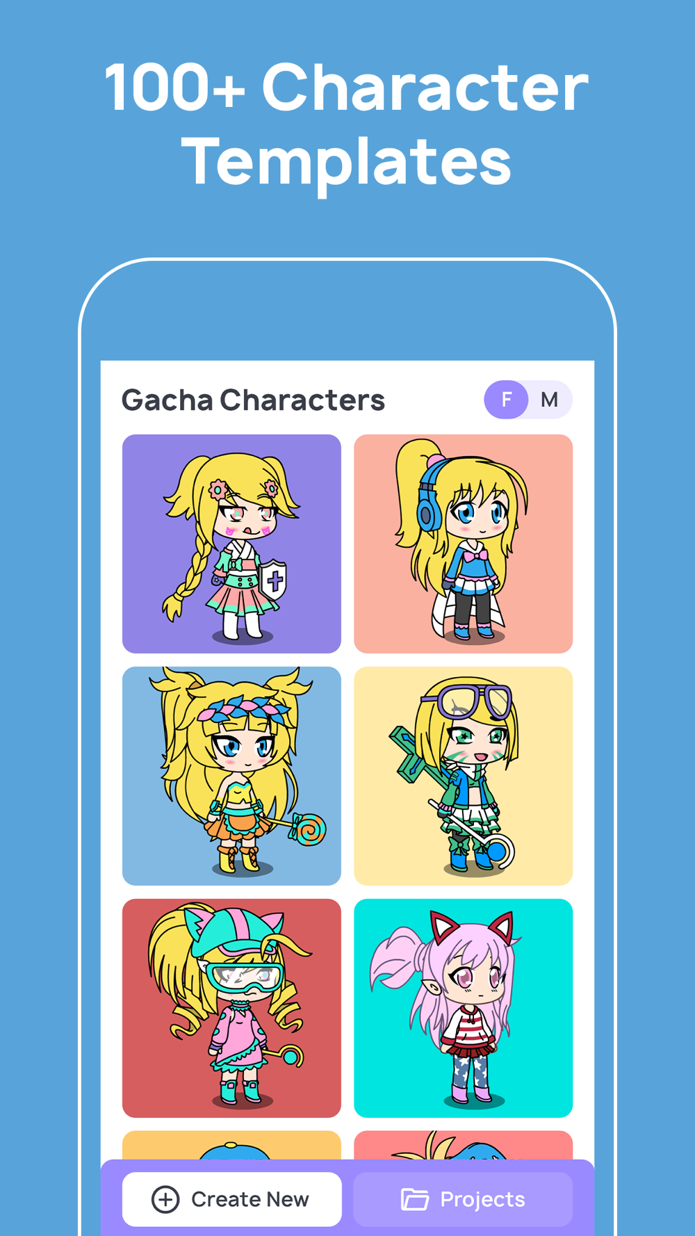 Create your own characters from ready made templates and dress them up in your custom fashion outfits in few taps! Choose from variety of dresses, shirts, hairstyles, weapons, and many more!