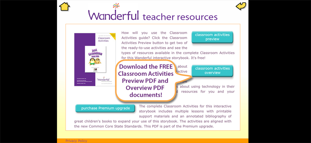 • Teacher resources include a 37 page overview of Wanderful Classroom Activities and a free preview of the Just Grandma and Me Classroom Activities guide