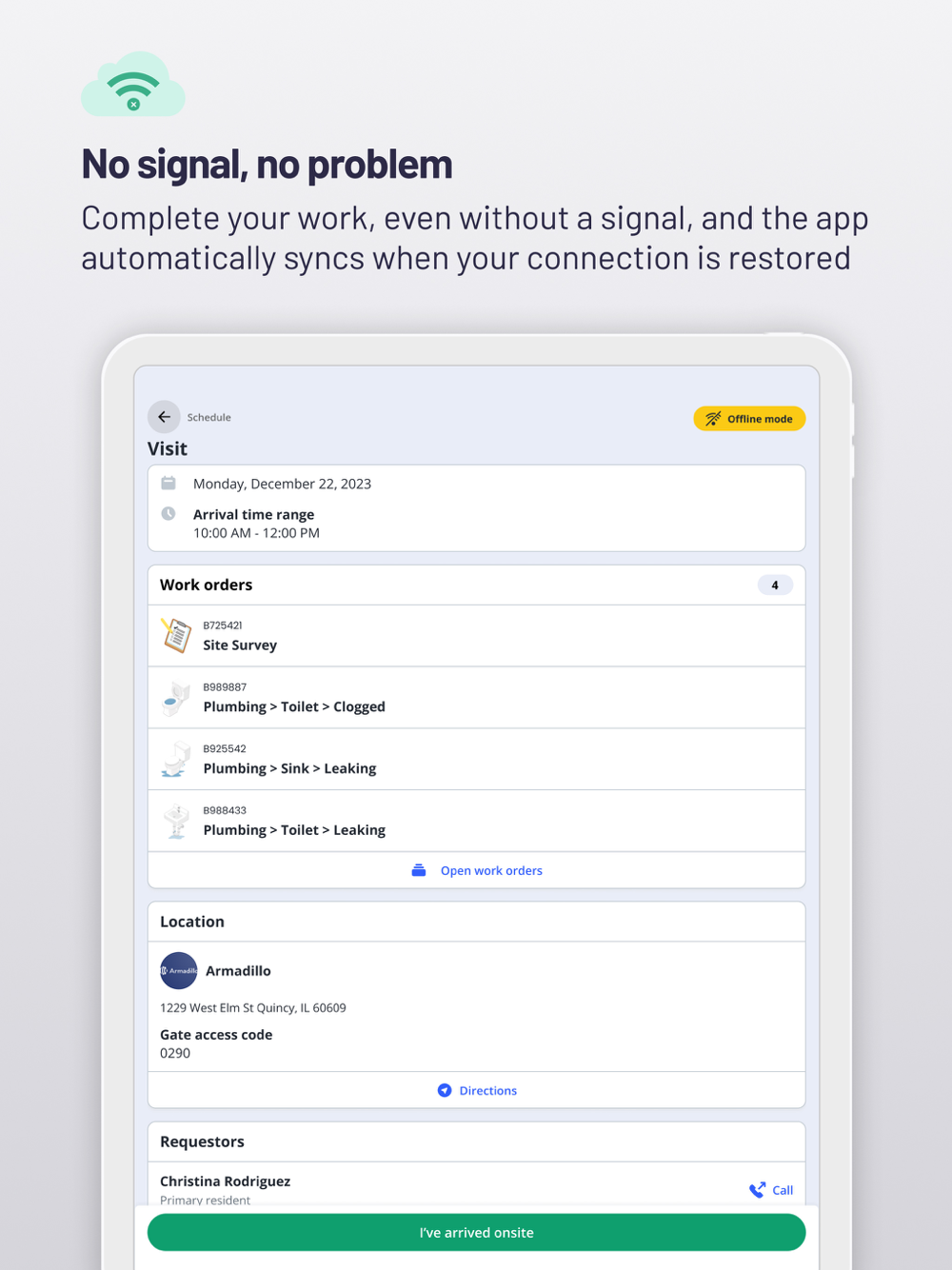 With One Onsite, technicians can see the work they need to do for the day, read through relevant information around the issue, location and historical work done while effectively executing their work on-site with minimal disruption.