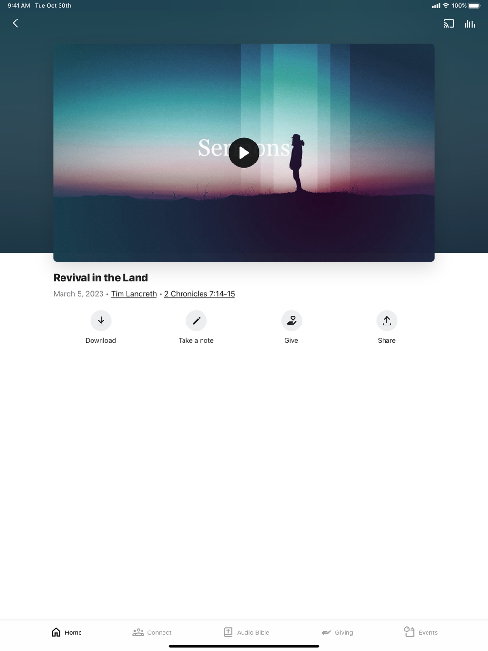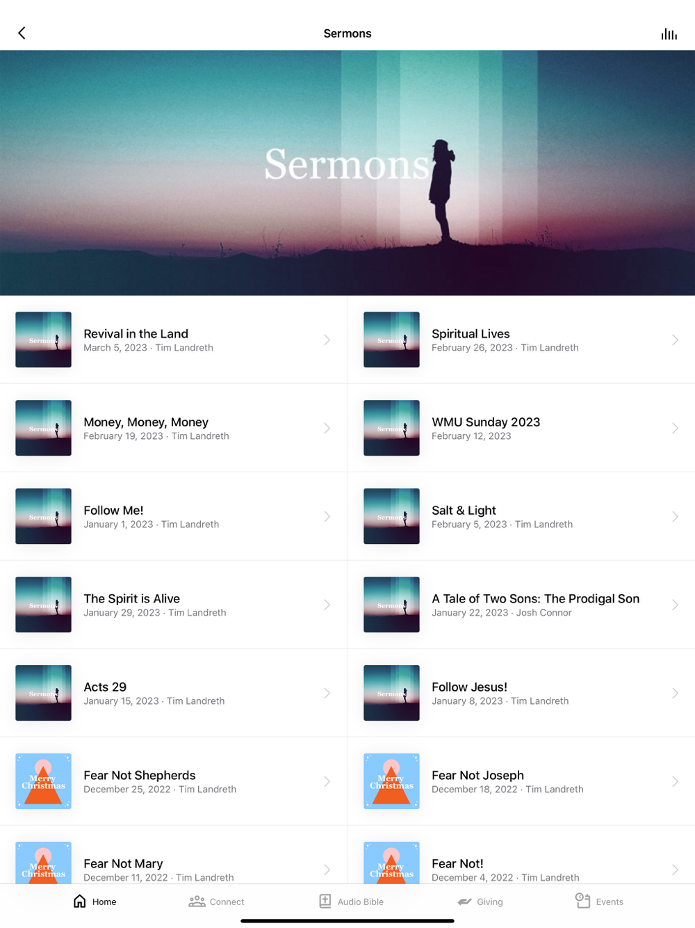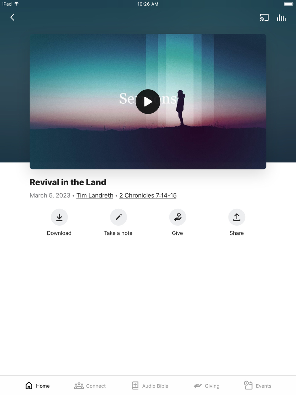 This app will help you stay connected with the day-to-day life of our church. With this app you can: watch or listen to past messages; stay up to date with push notifications; share your favorite messages via Twitter, Facebook, or email; and download messages for offline listening.