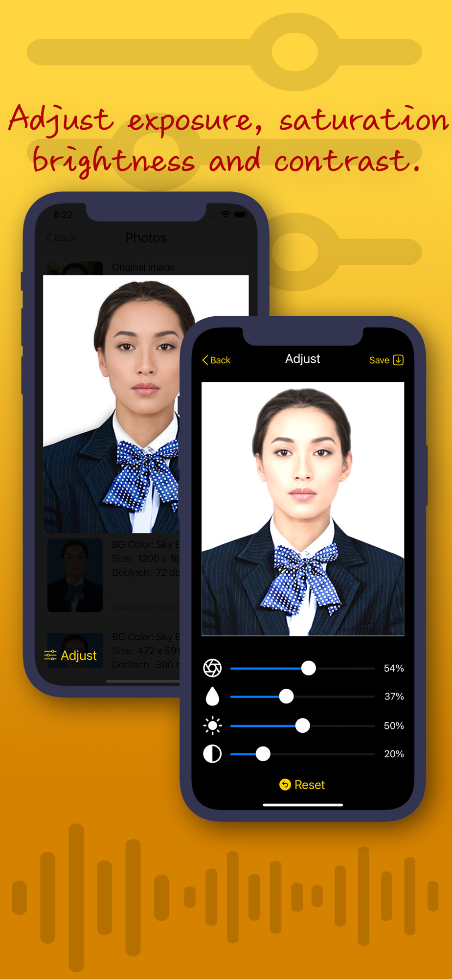 'SelfID Photo' applies person segmentation technique to replace the original background with some common colored backgrounds (white, sky blue and red). It also crops the photo into various formats and sizes commonly use for digital submission and printout. You can further adjust each single photo's exposure, saturation, brightness and contrast.