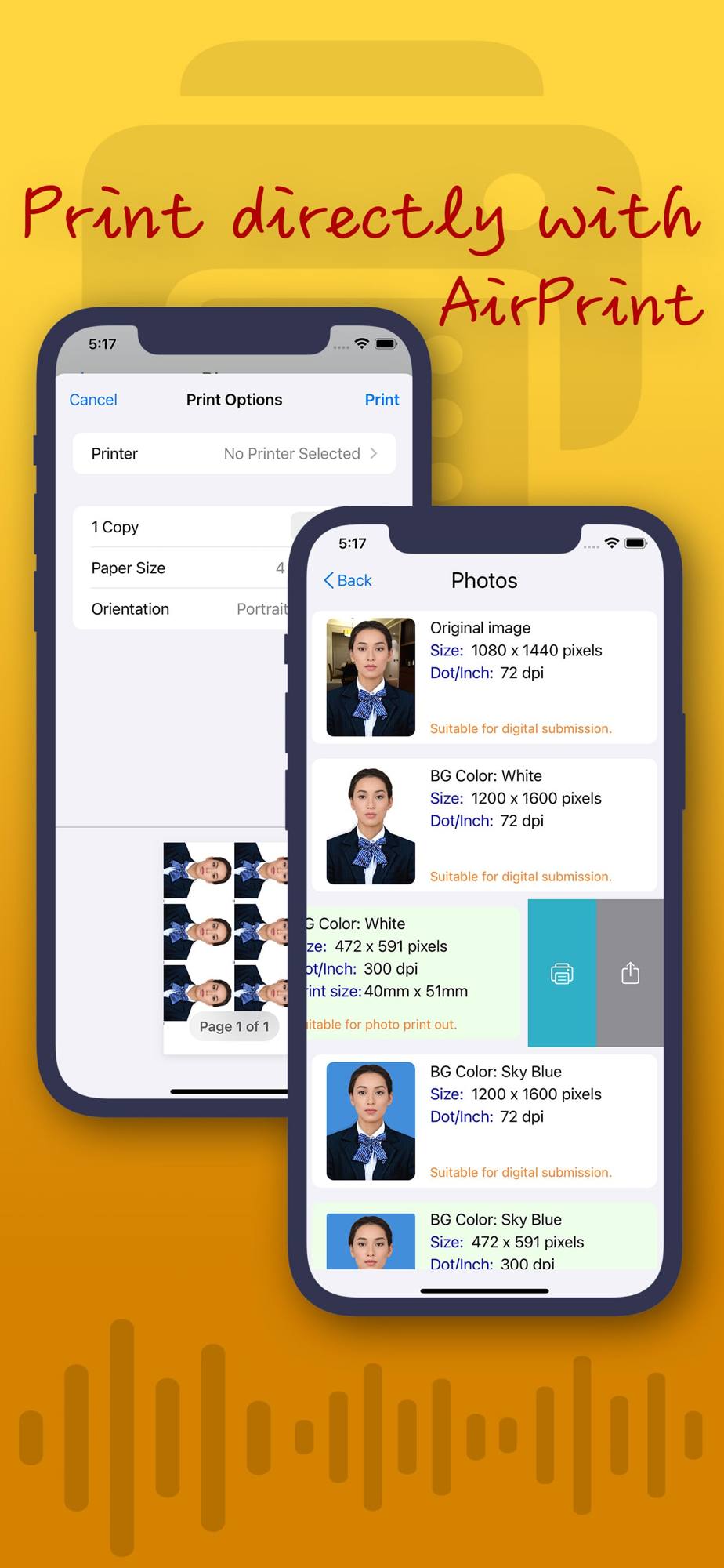 All photos taken by 'SelfID Photo' can be shared to other Apps in the iOS sharing menu, and those cropped to printable formats can also be printed directly to AirPrint supportable printer.