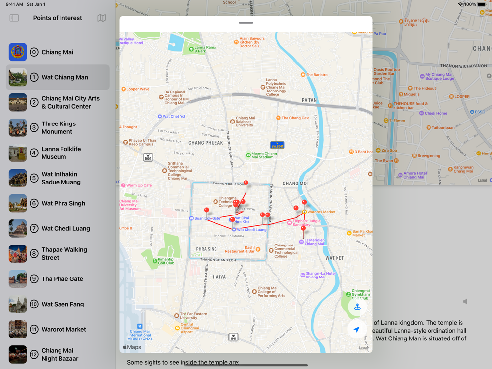 Each one of Chiang Mai landmarks is ordered following the walking tour and contains a description of the sight, a map of the situation and walking navigation indications to get from one point to the other using Maps. Landmarks contain a simple description so you can enjoy the surroundings and explore what interest you.