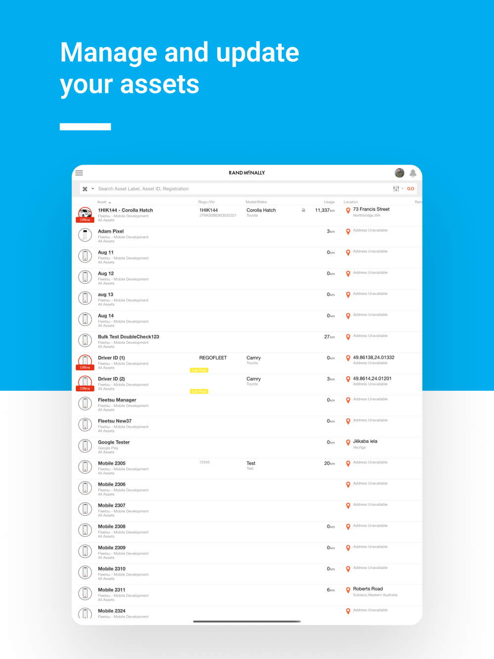 Rand McNally Manager is an administrator app for the Rand Platform. It allows you to manage your fleet real time from your mobile device without logging in to the Rand Platform web application.