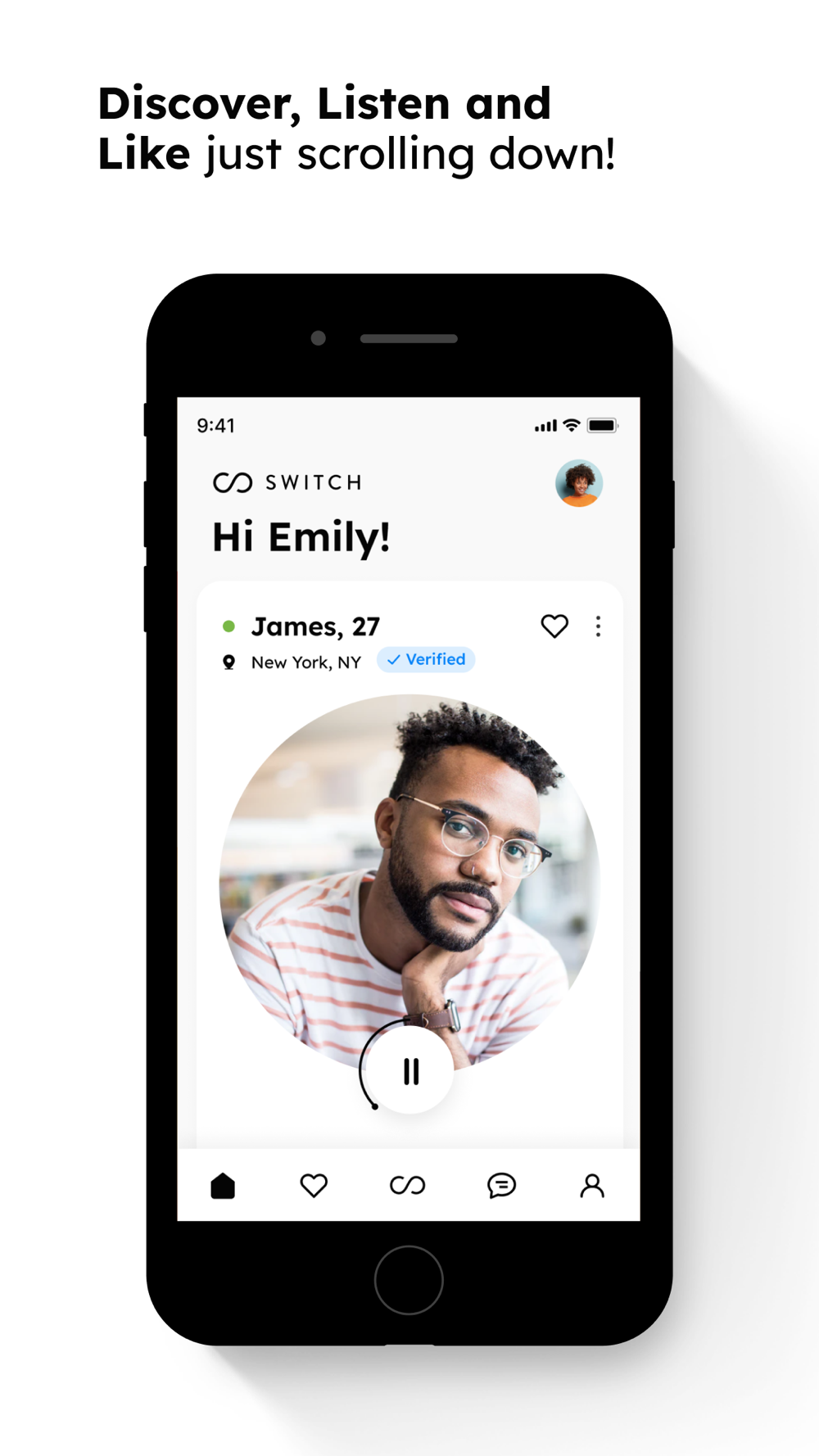 With SWITCH, you can experience real-time conversation - and real-time connection - right from your phone. To start, you’ll create your SWITCH Note: an audio message that gives a little glimpse of who you are. Choose from prompt options for inspiration - or freestyle and say whatever you feel shows off your true personality. Once you’re ready, it’s time to explore a timeline of profiles to choose your next 1:1 speed date from.