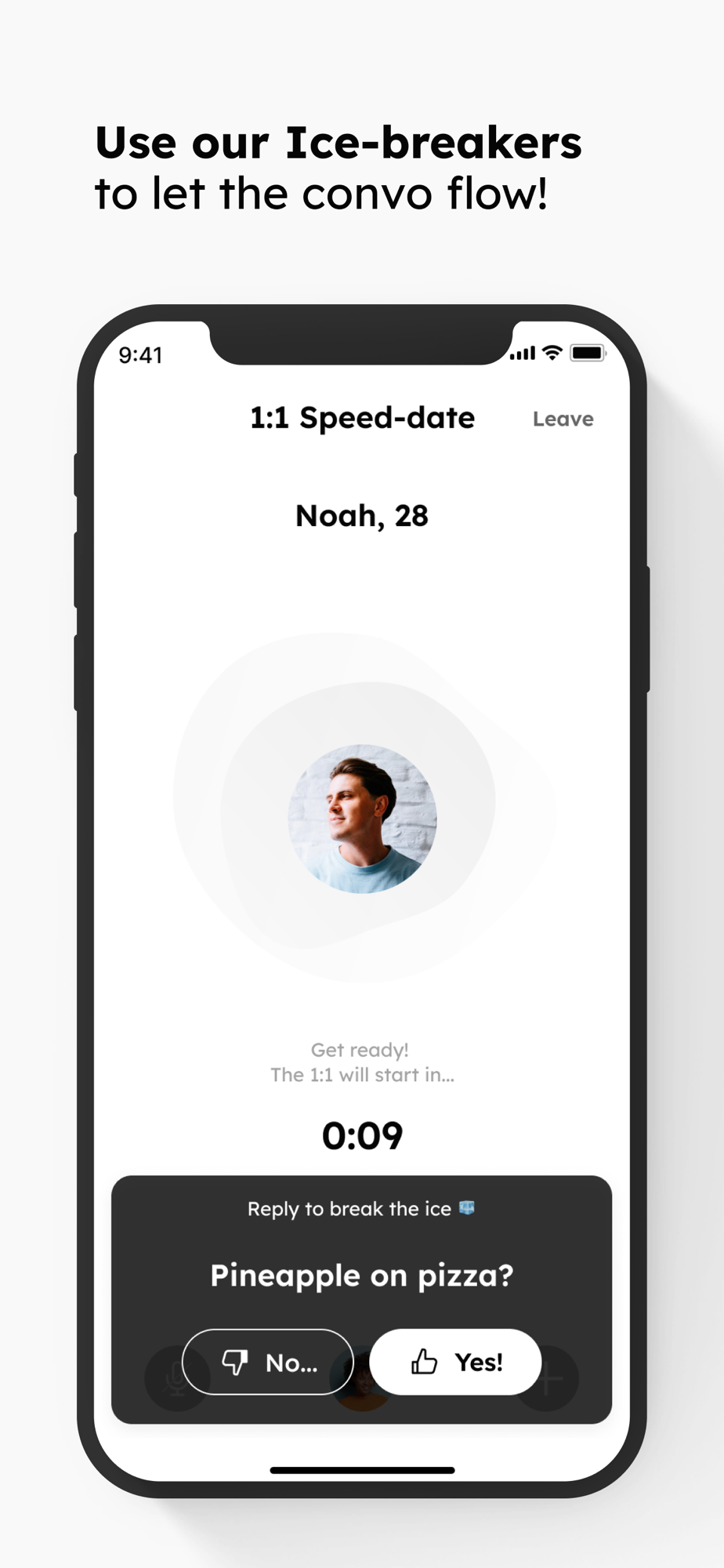 When you hear a SWITCH Note that you like on your homescreen, you’ll have the opportunity to send a 1:1 request for a 3-minute speed date with them, with built-in ice-breakers and conversation drivers (no awkward silences, please!), and see if sparks fly. If they’re not online at the moment, save their profile for a chance to connect later.