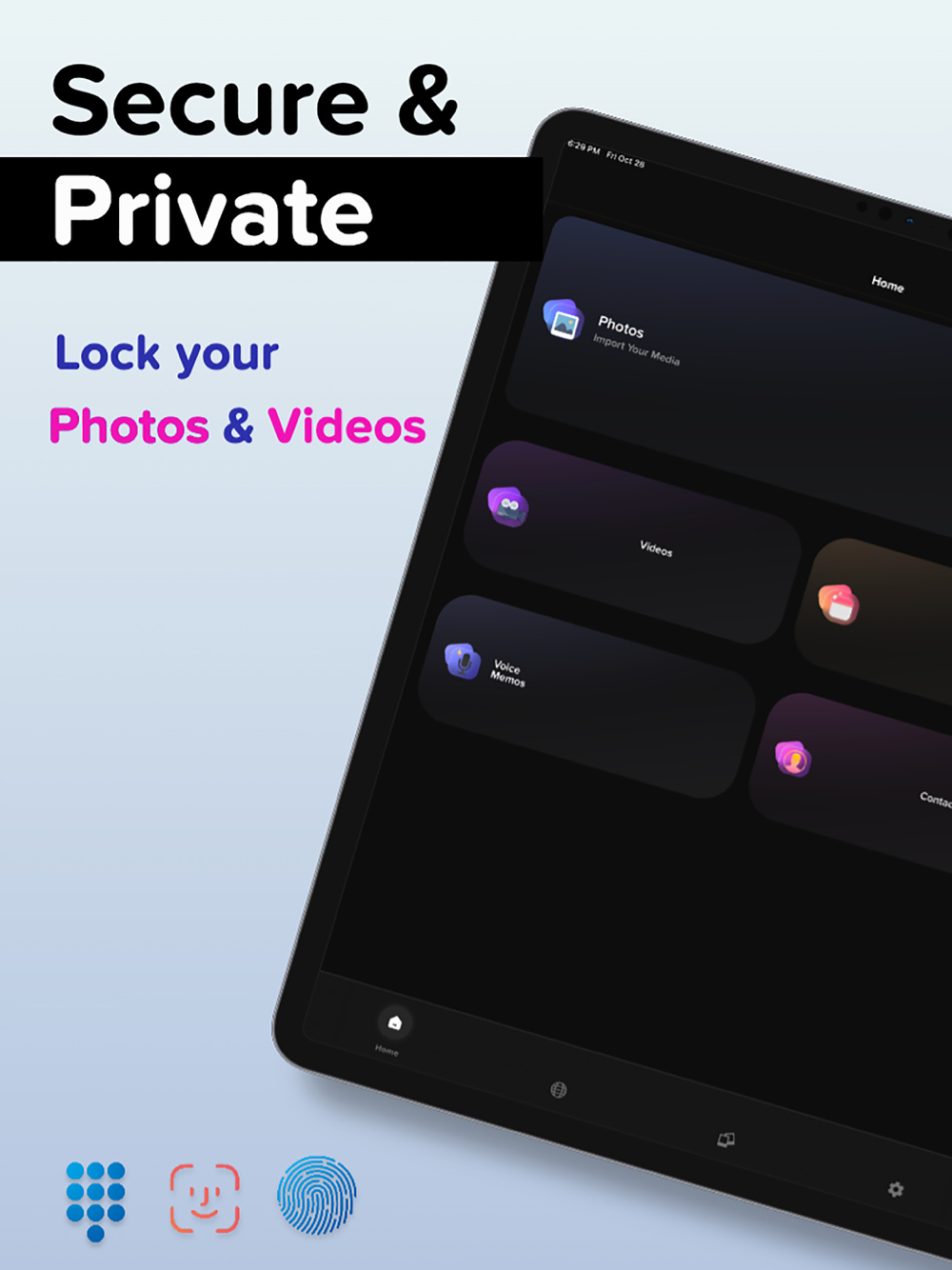 • Save your secret videos, photos, albums, voice memos and notes into private vault