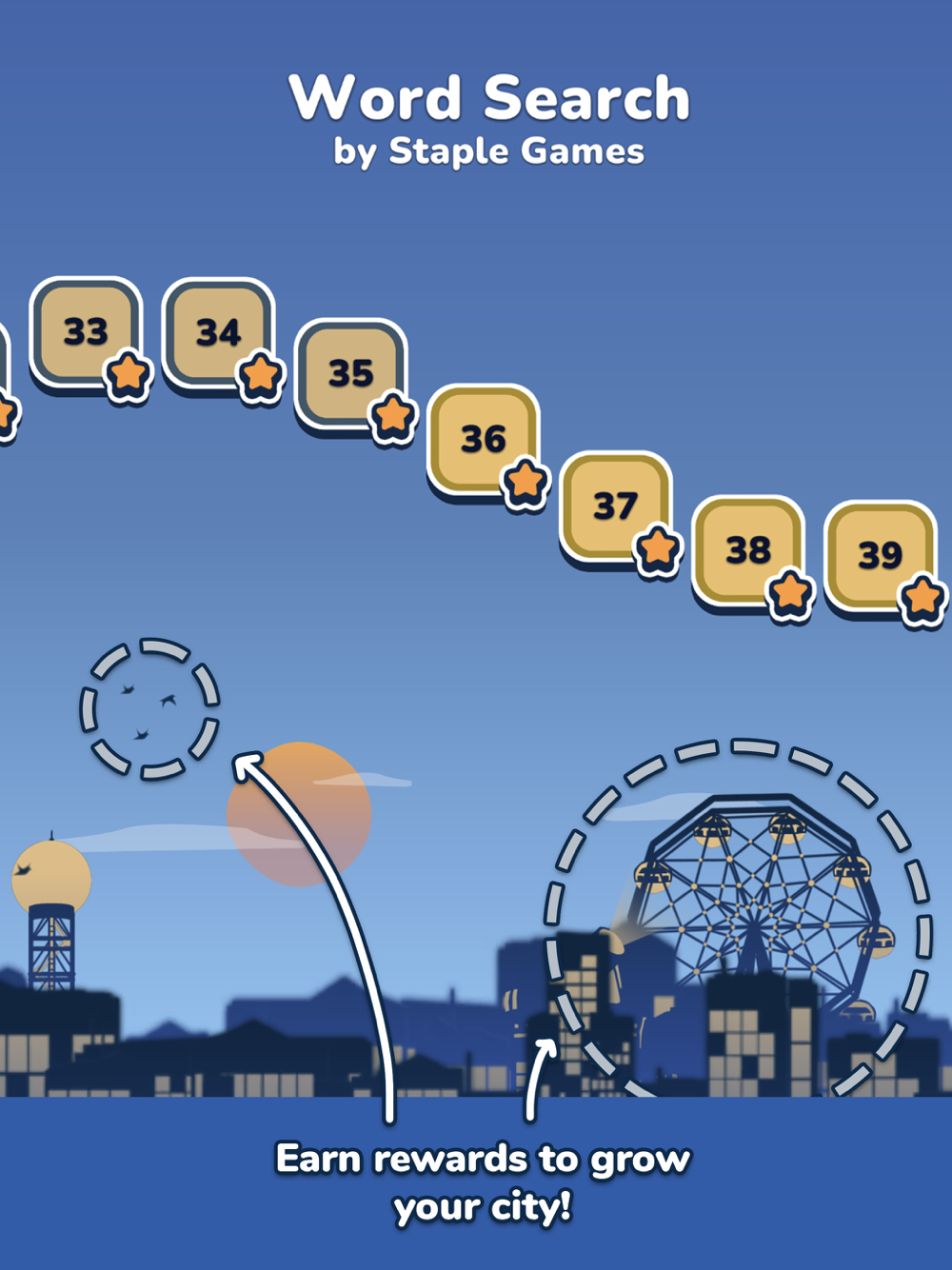Complete puzzles from themes like Toys and Games, Colors, and Animals. As you beat puzzles from a theme, your city will develop exciting new structures and occurences.
