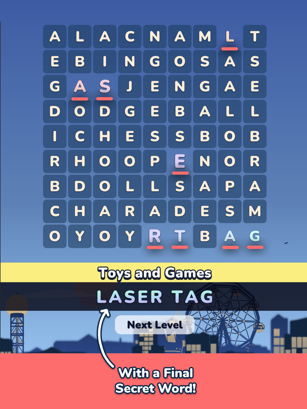 After completing each word search as normal, a final Secret Word will be revealed from all the unused letters!