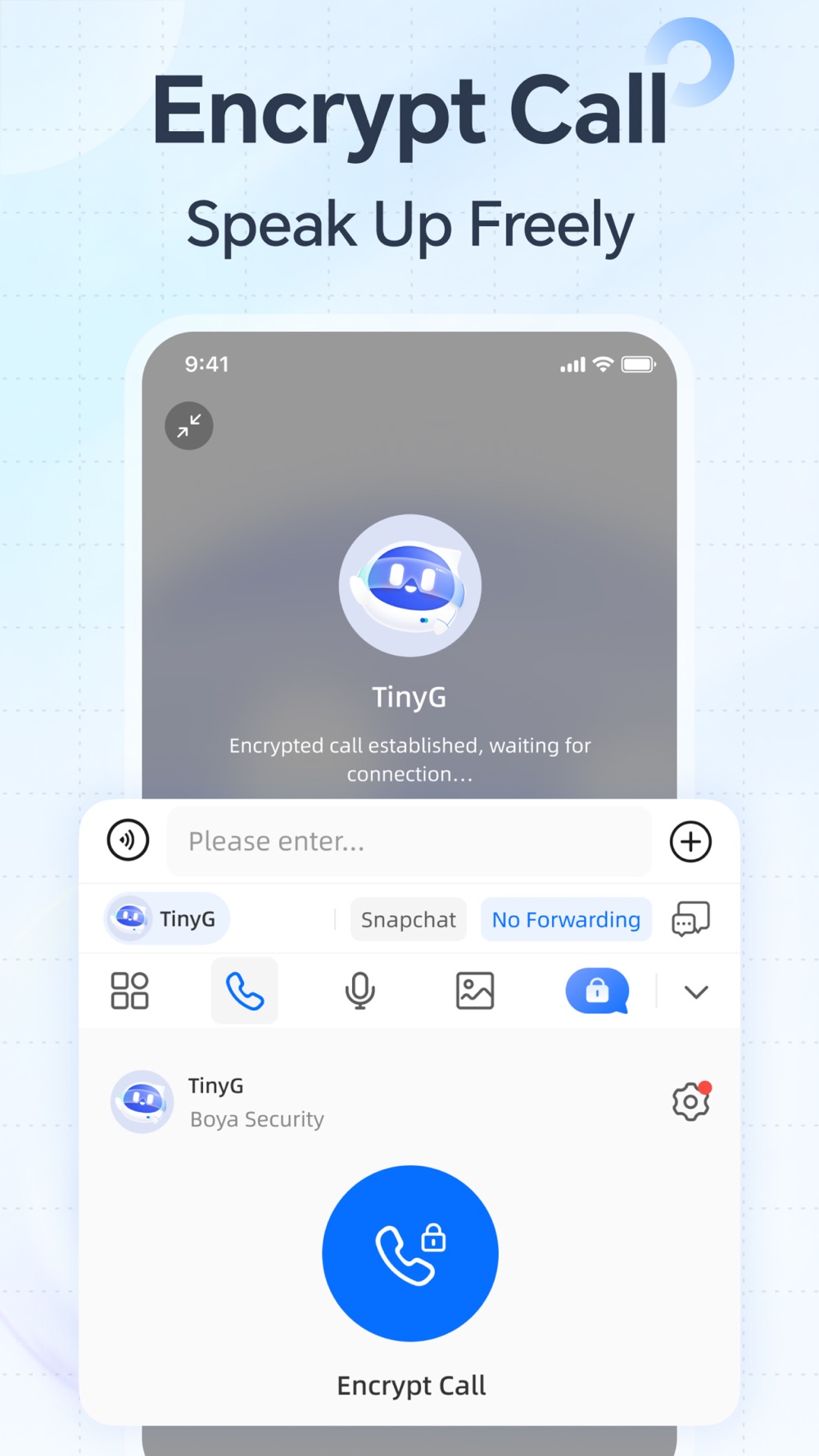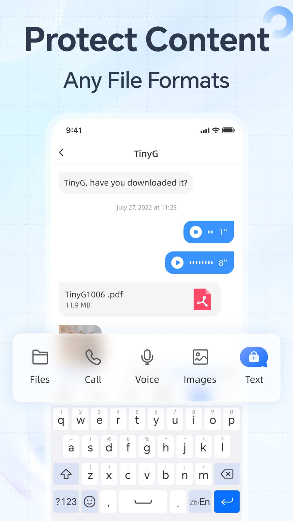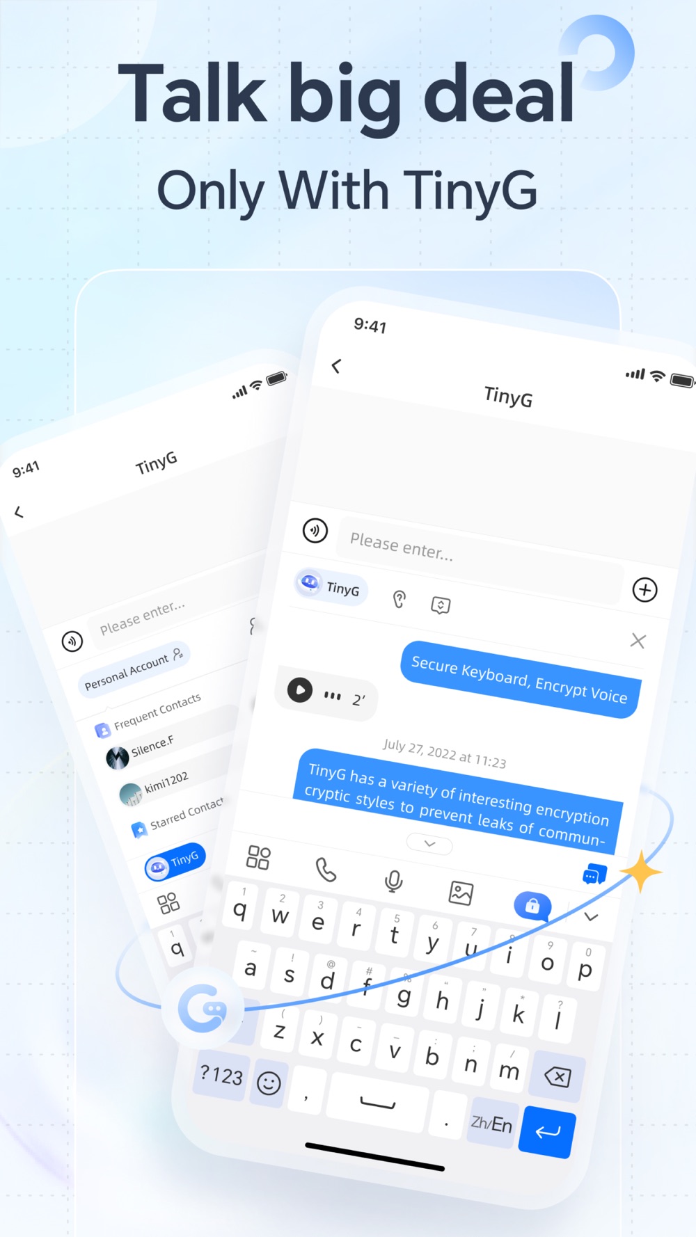 TinyG has a variety of interesting encryption cryptic styles to prevent leaks of communication content and safeguard your privacy. TinyG can support real-time encrypted calls, encrypted voice, encrypted pictures, encrypted files and any kinds of files.