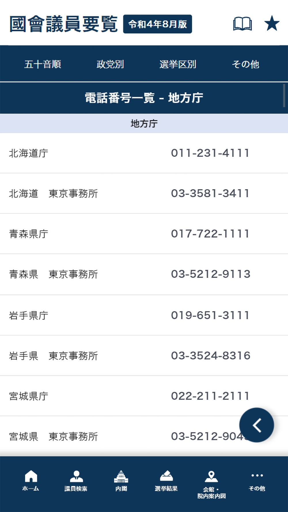 ・電話番号:地方庁、特殊法人、認可法人、地方共同法人、共済組合等、主要団体、労働組合、報道関係