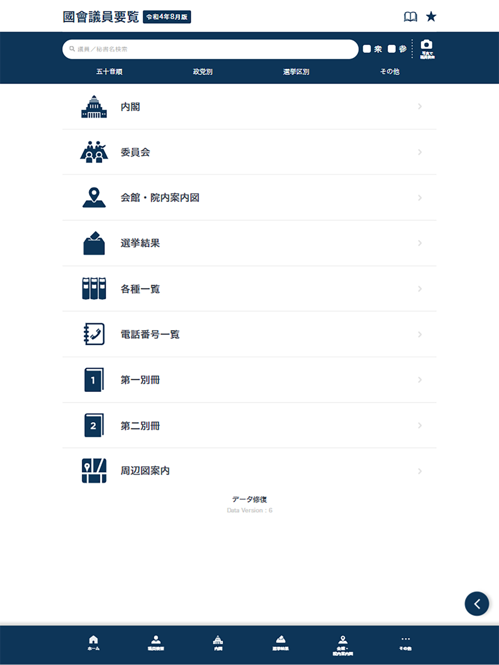 ・各種一覧:国会の勢力分野、大臣・秘書官・副大臣・大臣政務官・事務次官一覧、衆・参両院常任・特別委員長、委員会、各政党役員、衆・参議員議員勤続年数・当選回数表、党派別国会議員一覧、自由民衆党内派閥一覧、省庁幹部職員情報、地方庁