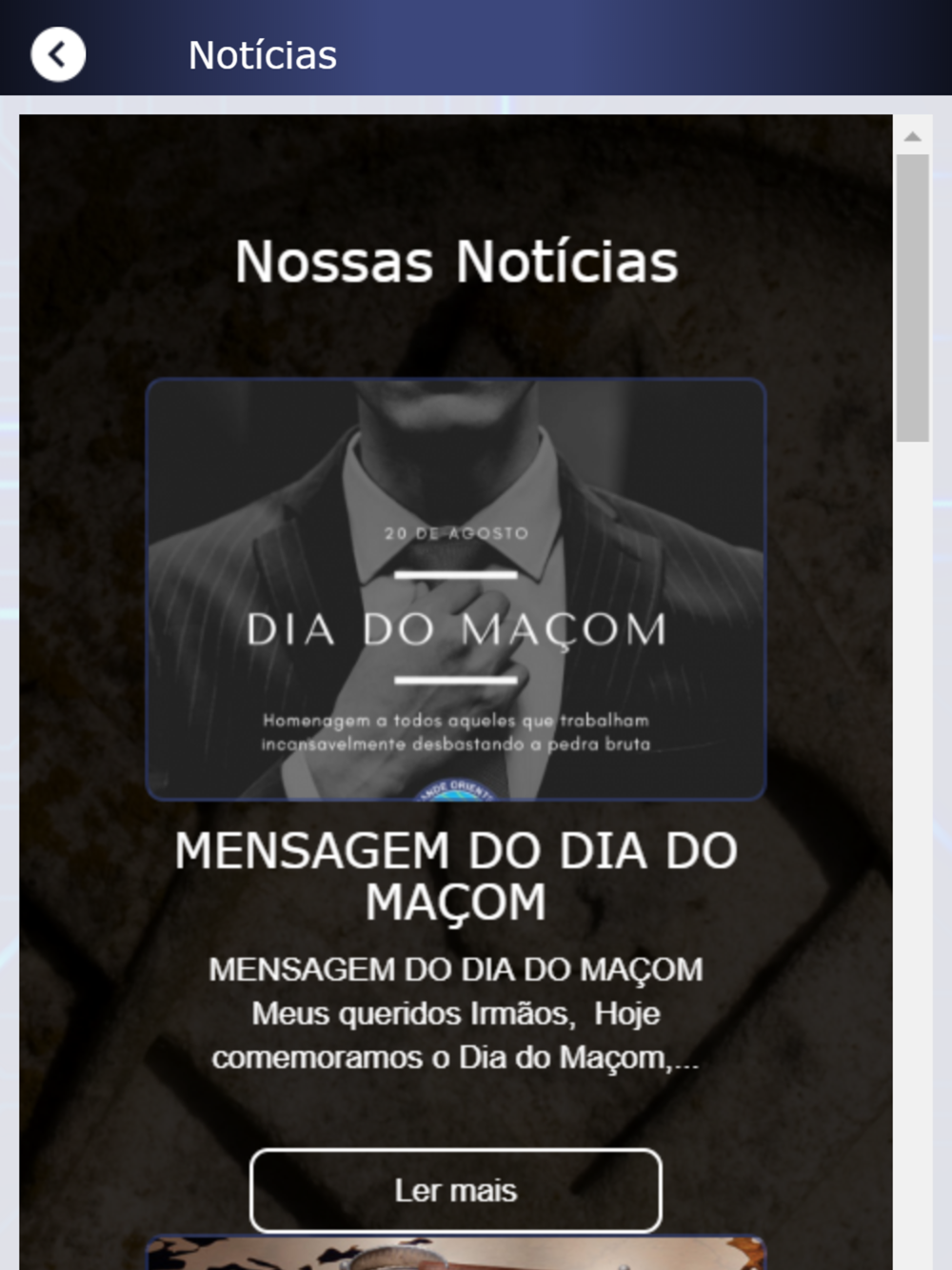 Através do menu "Sobre o GOBA", ter acesso a informações a respeito dos valores e finalidades do Grade Oriente da Bahia.