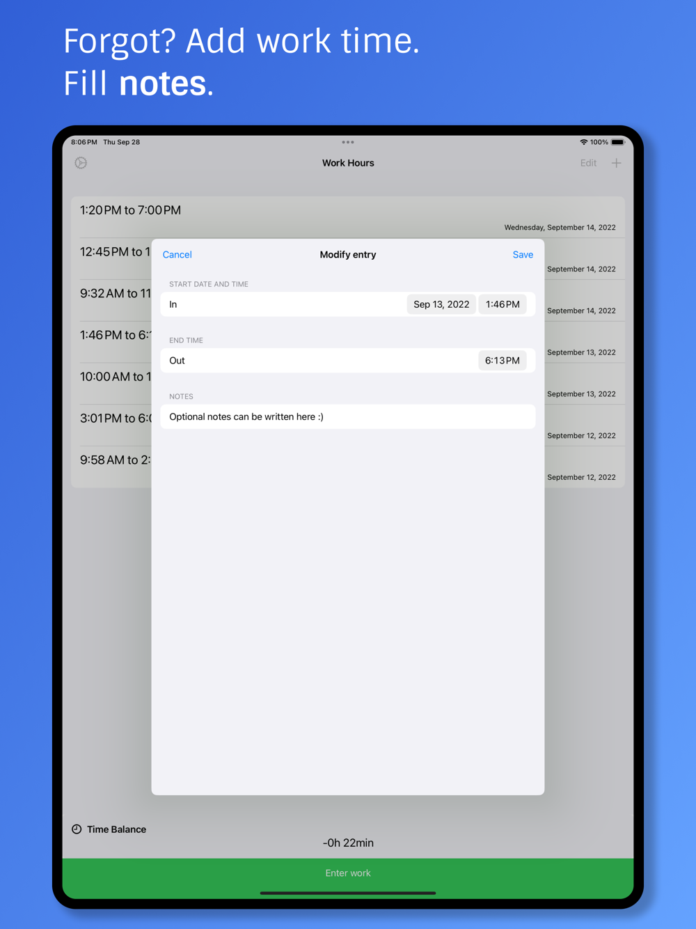 Optional Notes: Need to log what your worked on? Add notes to a work log entry to record additional information.