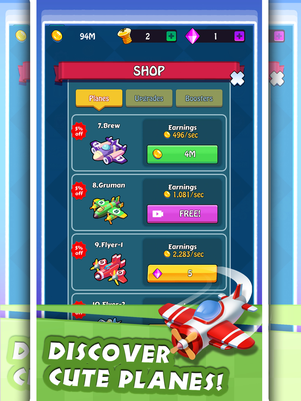 Merge Plane to create an idle tycoon empire! Build your airline empire, collect cute funny airplanes and make the most impressive collection in the world.