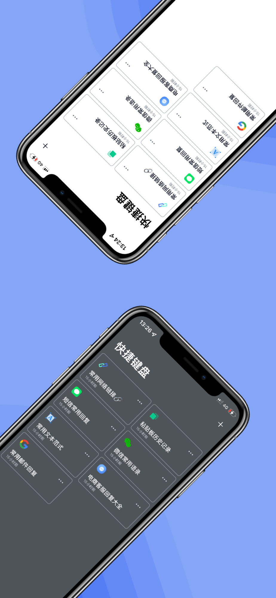 保存平时常用、繁琐、重复的的文本。然后通过切换键盘直接使用键盘输入。同时快速访问您的粘贴板,帮您快速输入。
