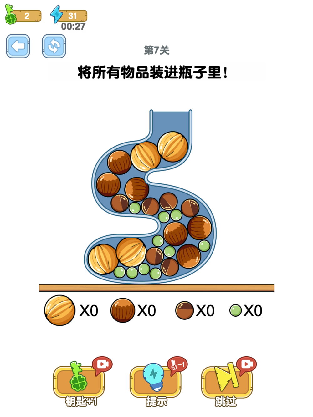 想办法将坚果都装进瓶子 根据坚果的大小来进行摆放 看似简单却超难