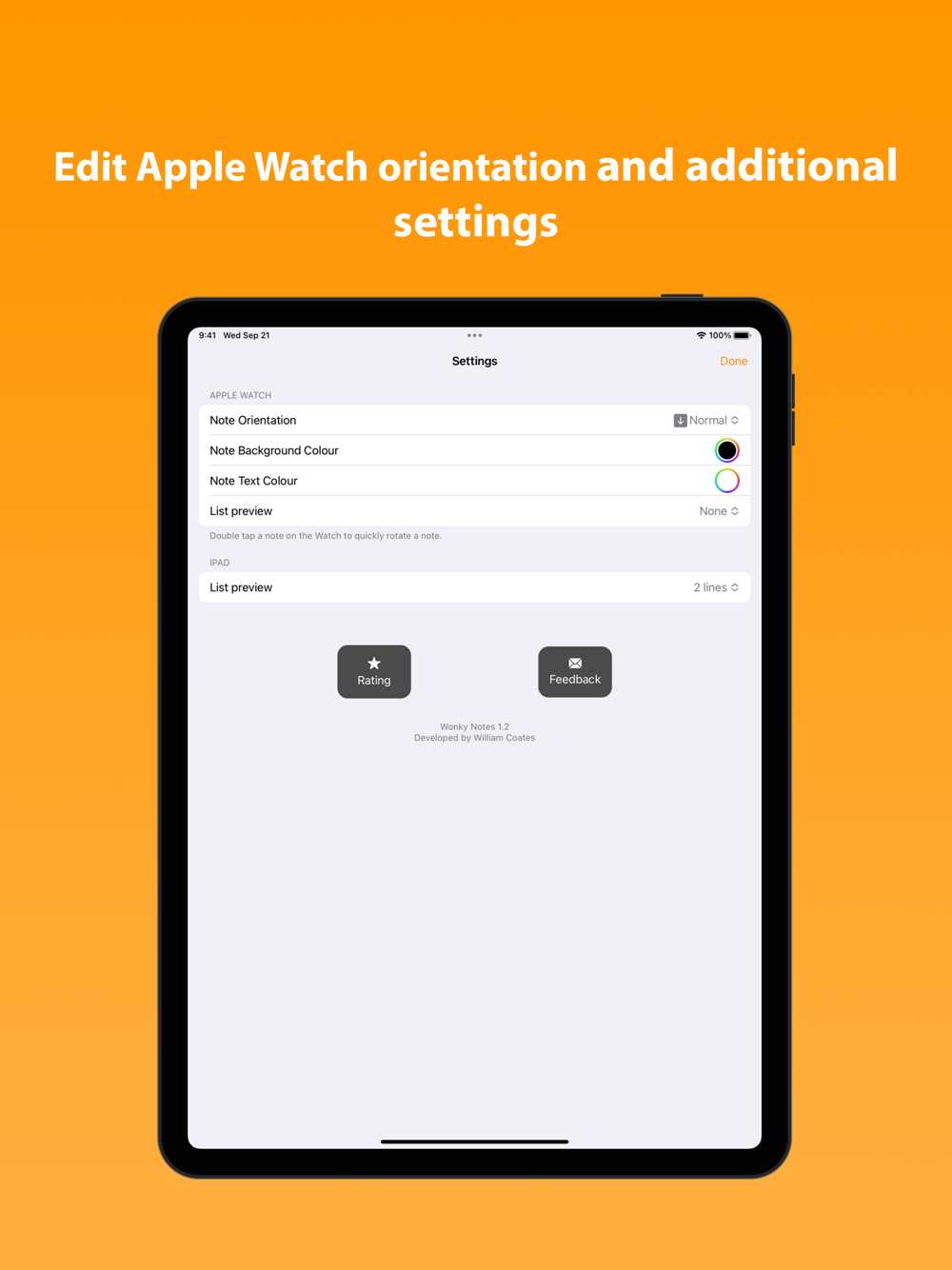 Settings allow you to set the note orientation on Apple Watch at 90 degree intervals. Additionally, enabling you set background and text colour of notes viewed on Apple Watch.