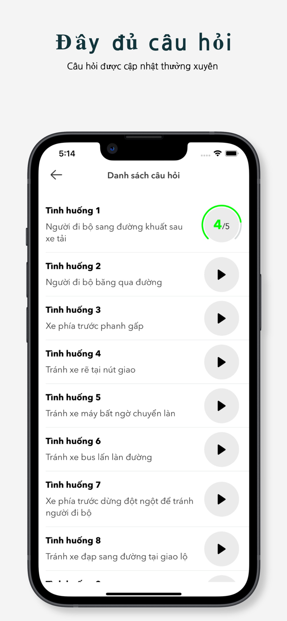 Giúp các bạn làm quen với một số tình huống giao thông phức tạp có thể xảy ra. Thông qua quá trình ôn tập và kiểm tra, giúp các bạn hình thành phản xạ nhận biết một số nguy cơ tiềm ẩn nguy hiểm khi tham gia giao thông