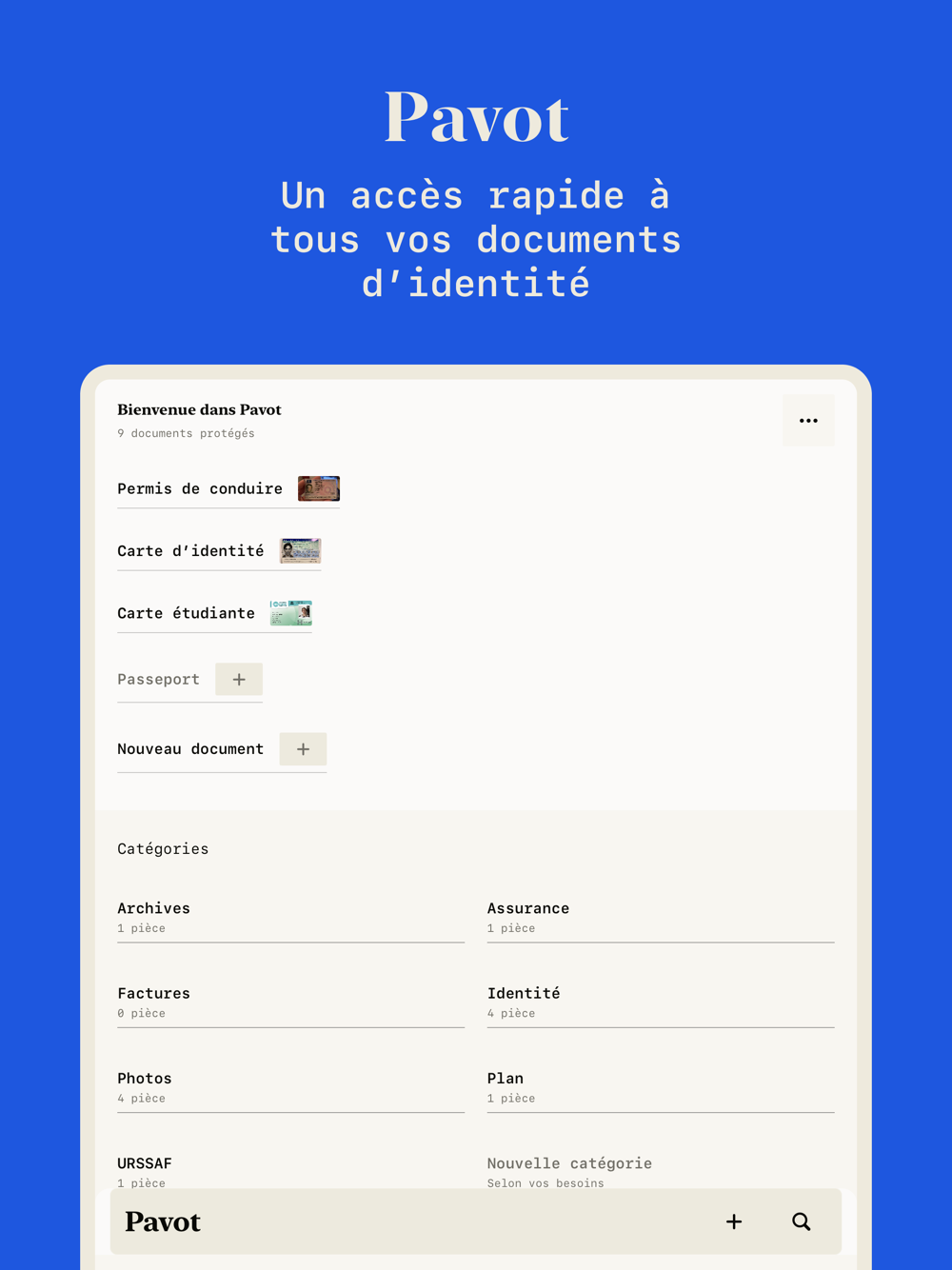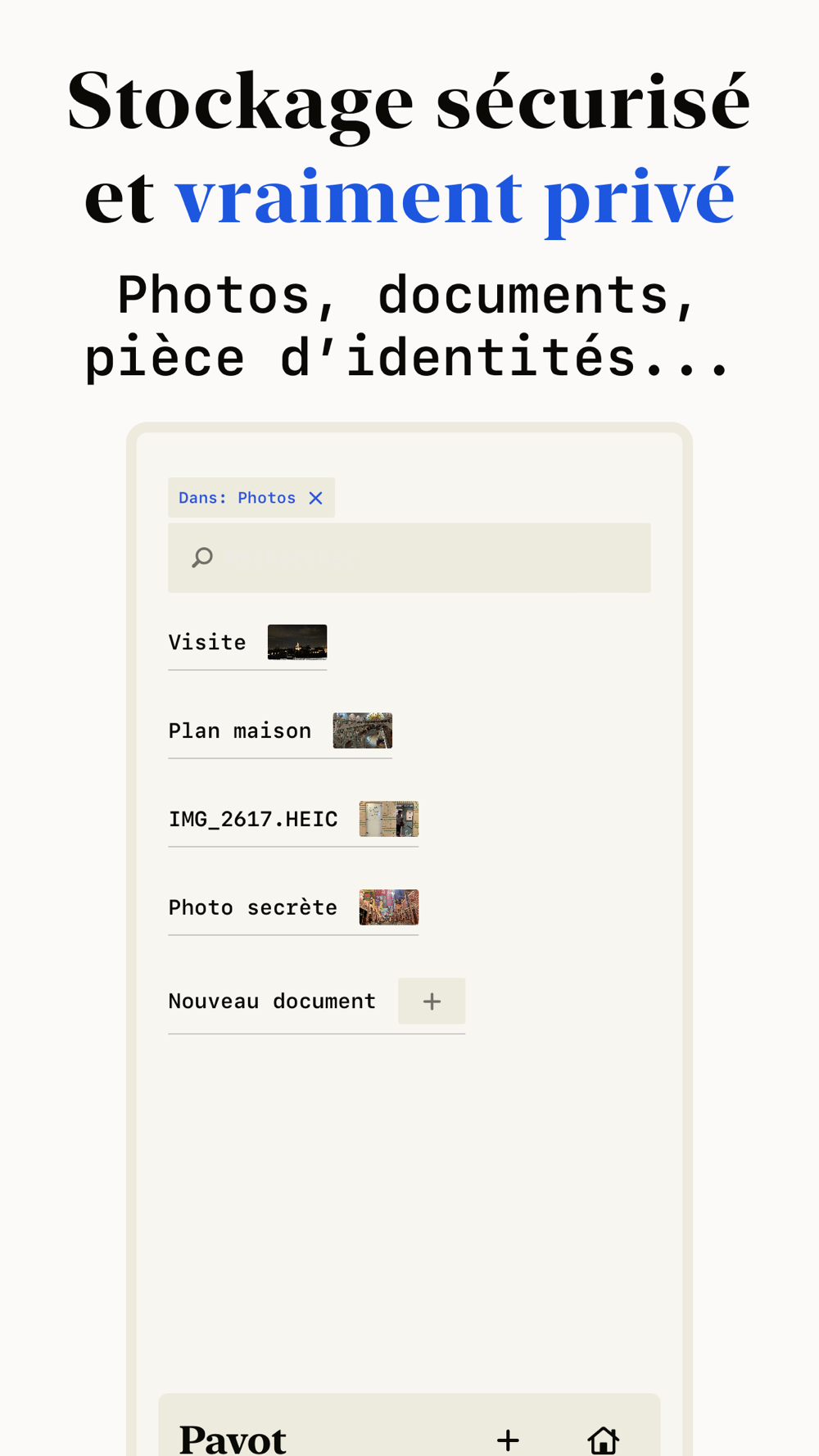 Votre pièce d'identité à portée de main, vos photos dans un espace privé, vos documents dans un coffre chiffré synchronisé entre vos appareils.