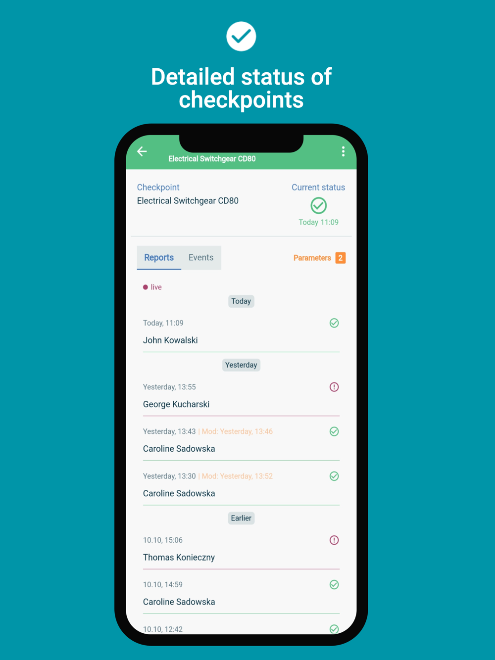 Manufacturing plant, warehouse, hotel, security company, cleaning company, etc. Wherever it is required to check the status of specific checkpoints, the app will help to quickly and easily inform about the status of a particular place or device.