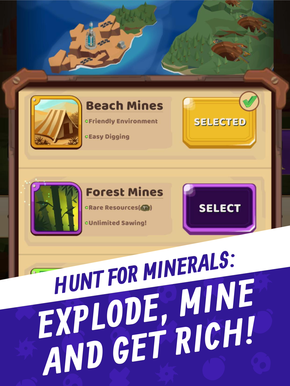 -Blast and Mine: Use your bombs to uncover minerals and discover rare resources. Every explosion can bring a big reward!