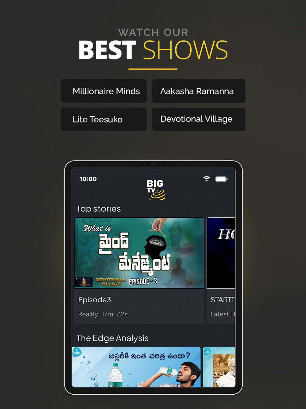 BIG TV is India’s first 24x7 regional news streaming OTT platform in Telugu language. Owned by Pravasa Media LLP, BIG TV will be prominently viewed in Telangana and Andhra Pradesh, it can be accessed from anywhere across the world.