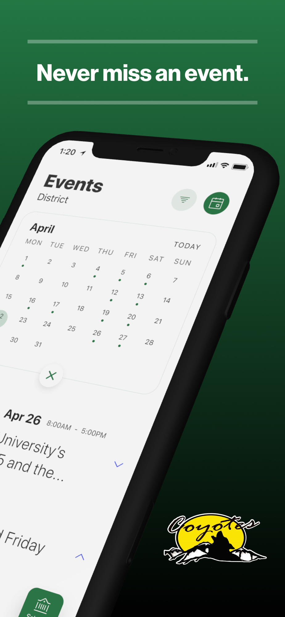 The event section shows a list of events throughout the district. Users can add an event to their calendar to share the event with friends and family with one tap.
