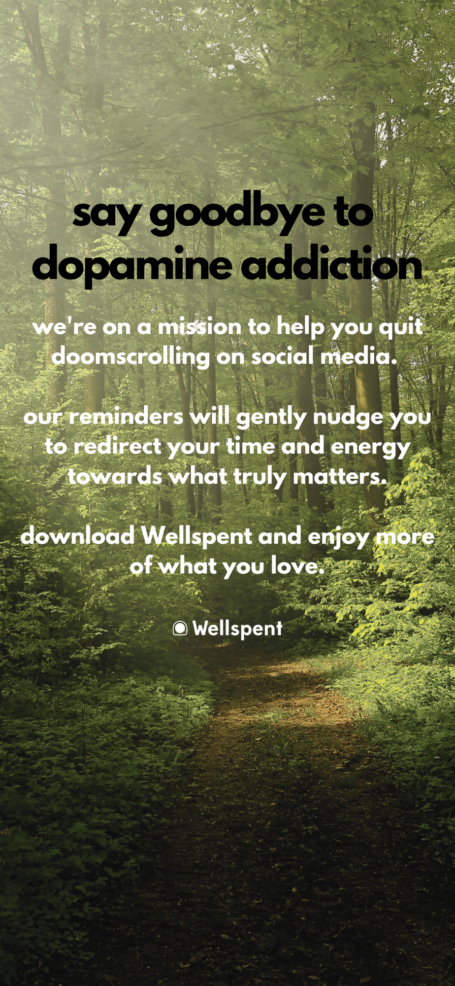 The subscription renews automatically unless it is cancelled at least 24 hours before the end of the current term. Your iTunes account will be charged for the next term within 24 hours before the current subscription expires. You can turn off auto-renewal at any time through iTunes Account Settings. Any unused portion of a free trial will be forfeited if you purchase a subscription. For more information, see our Terms & Conditions (https://www.wellspent.so/terms-and-conditions) and our Privacy Policy (https://www.wellspent.so/privacy-policy).