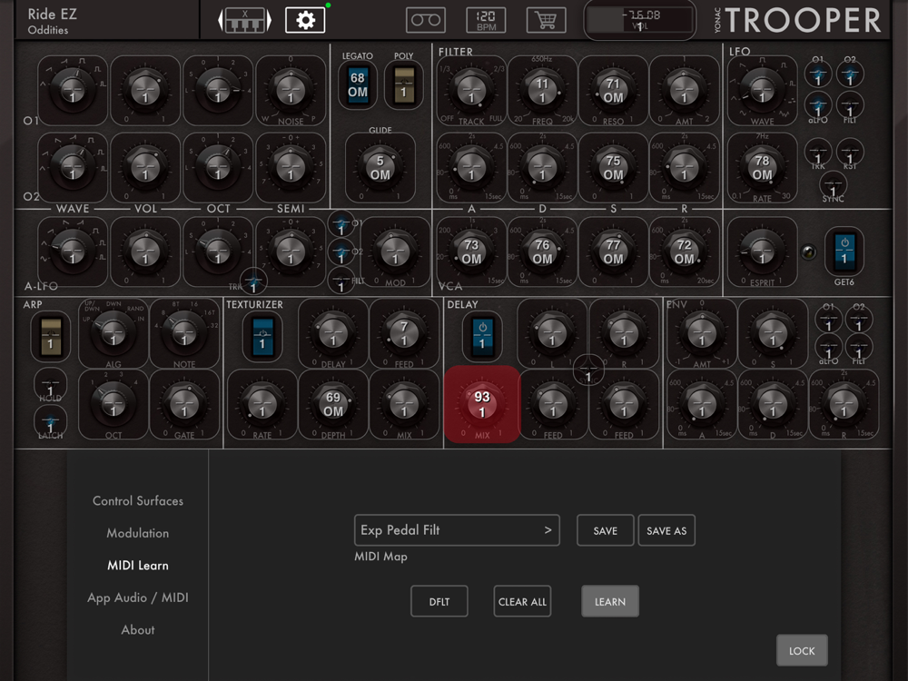 The arpeggiator inspires rhythms with five algorithms, variable note value, octave range, and gate. The “Texturizer" purveys a wide range of modulation effects that include chorus, flanging, variable comb, resonant delay, and stereo imaging. The BPM-syncable two-tap delay has time and feedback controls per channel, and is tuned a little darker than our usual offerings. Trooper can run in monophonic or polyphonic mode, the latter providing up to 12 voices. Legato is available in either mode.