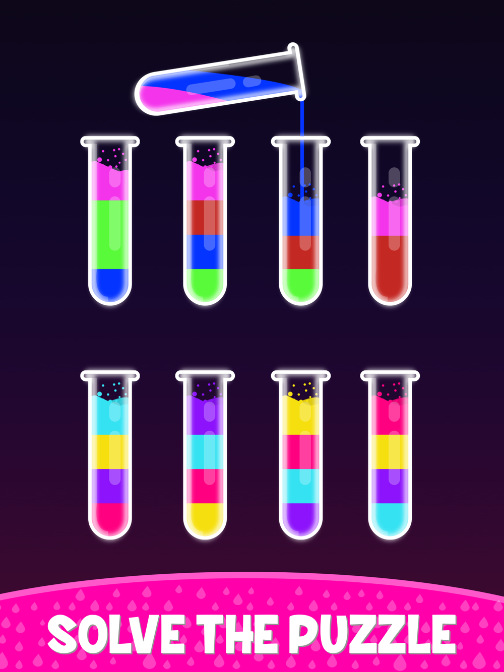 Arrange liquids of various colors by pouring water into tubes until each tube is filled with the same color water. You may easily pass the first few levels. But do not take it lightly. The later levels will get harder and harder. The higher level you play, the more difficult it would be, and the more careful you would be for each move. These type of puzzle games stimulates your brain in a very fun and challenging way.