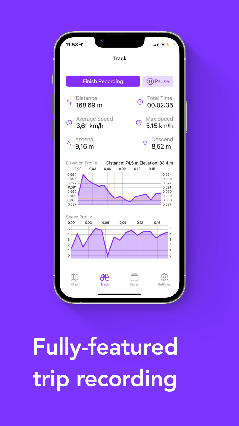 Everest GPS comes with a powerful track recorder. Simply start recording when beginning your trip. All GPS data including distances, speed, and elevation will be saved.