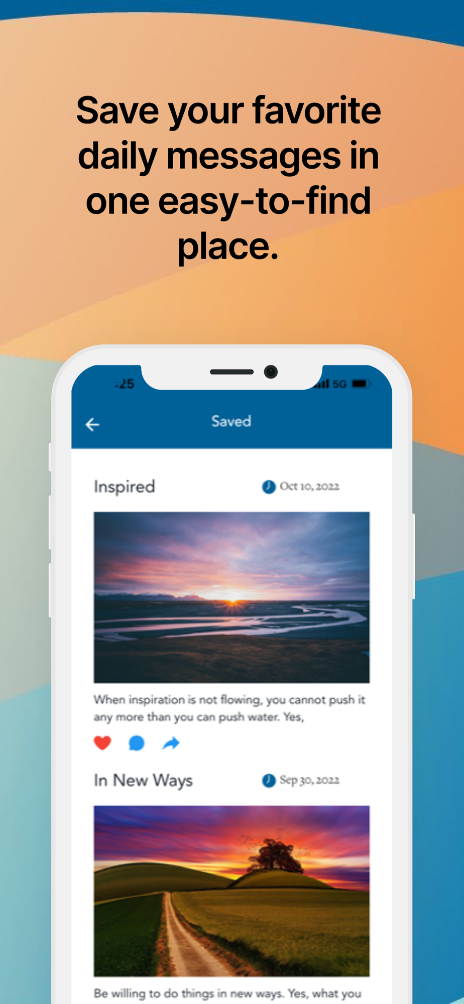 Search the entire treasury of messages by special dates or keywords and see how they speak to your soul. Click the heart to save your favorite daily messages. Click the call-out balloon to leave an uplifting comment and connect with your community of kindred spirits. Click the share arrow to spread the ripples across the globe.
