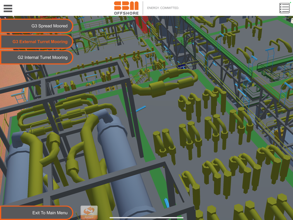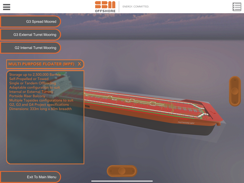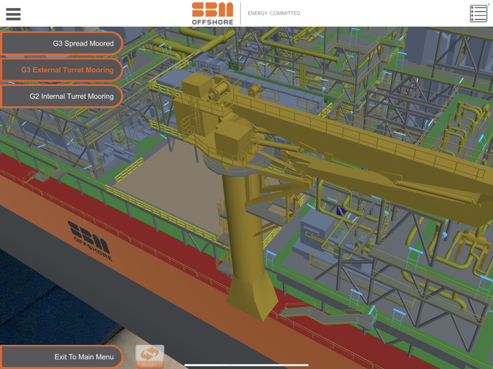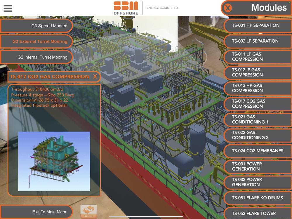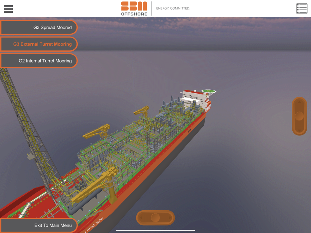 The SBM Offshore Fast4Ward AR experience creates an exciting atmosphere by showcasing the various topside modules, internal turret, external turret, and spread moored configurations through augmented reality.