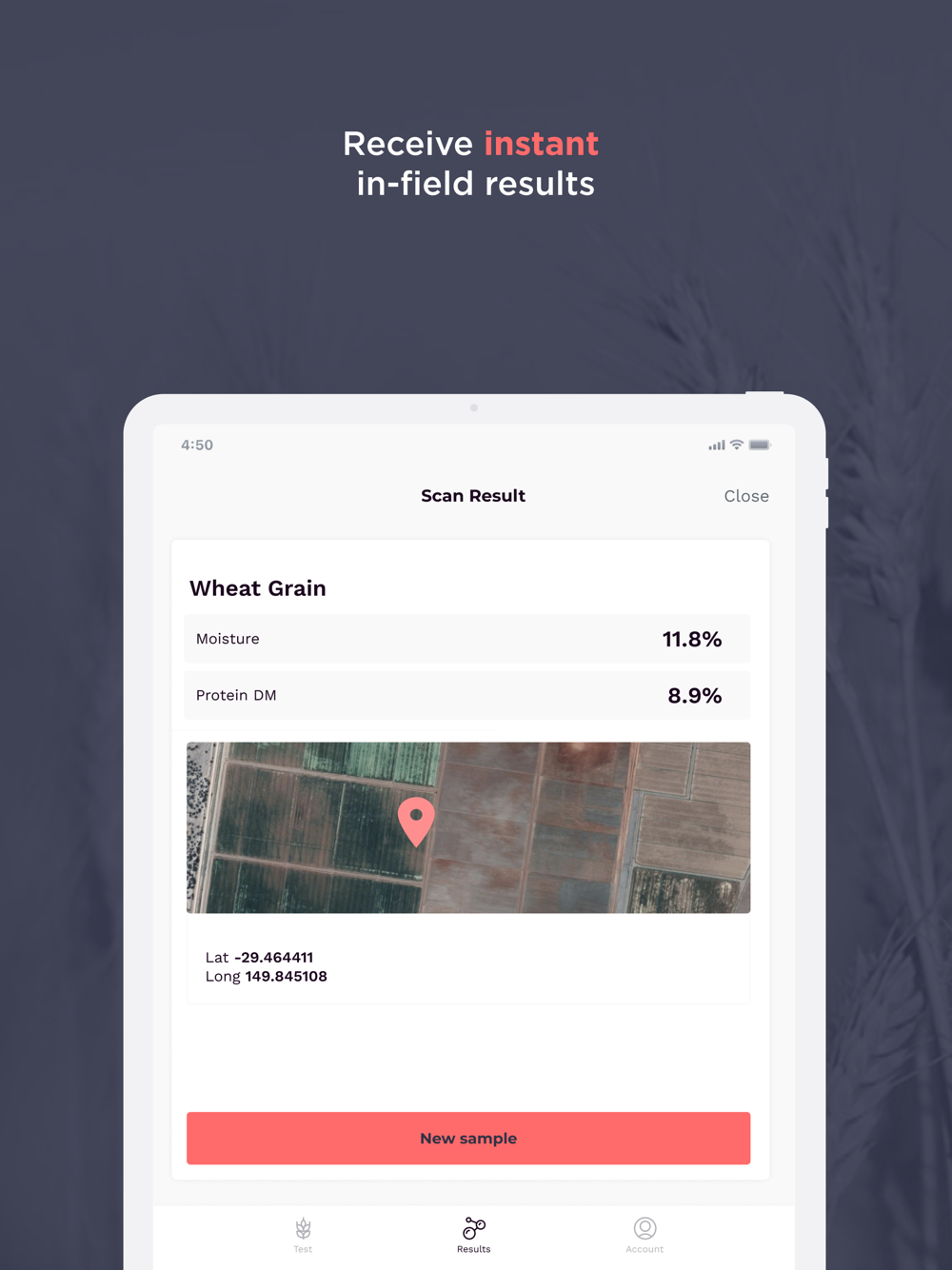 Analyse protein and moisture content of wheat and barley samples directly in the field with the Hone Lab mobile app. Connect wirelessly to your Hone Lab Red device to rapidly view results for informed harvest and storage decisions.