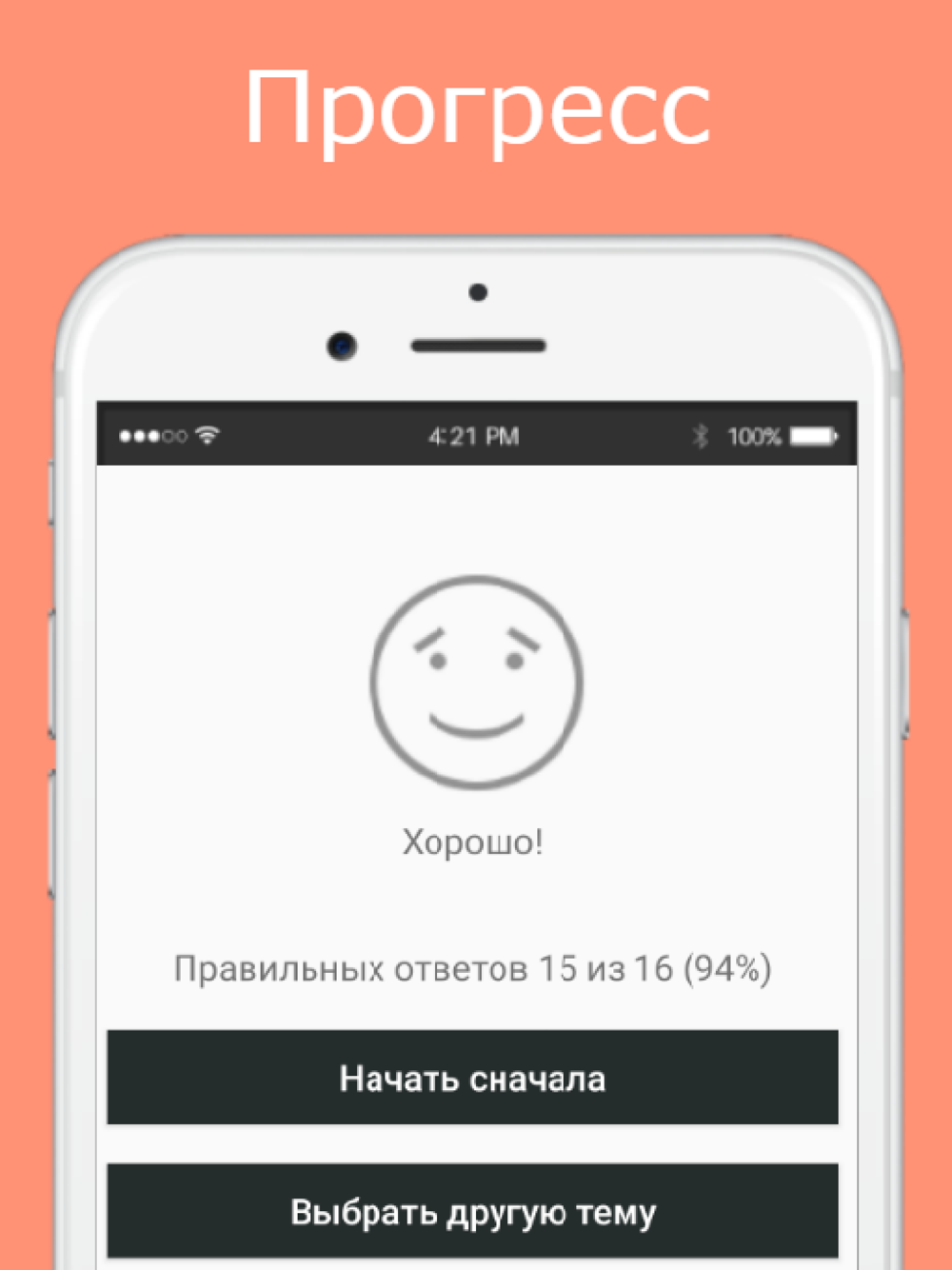 После прохождения теста по выбранной теме, можно просматривать ошибки. Также, результат прохождения теста по каждой из тем сохраняется, ваша цель - выучить все слова в выбранной теме на 100%.
