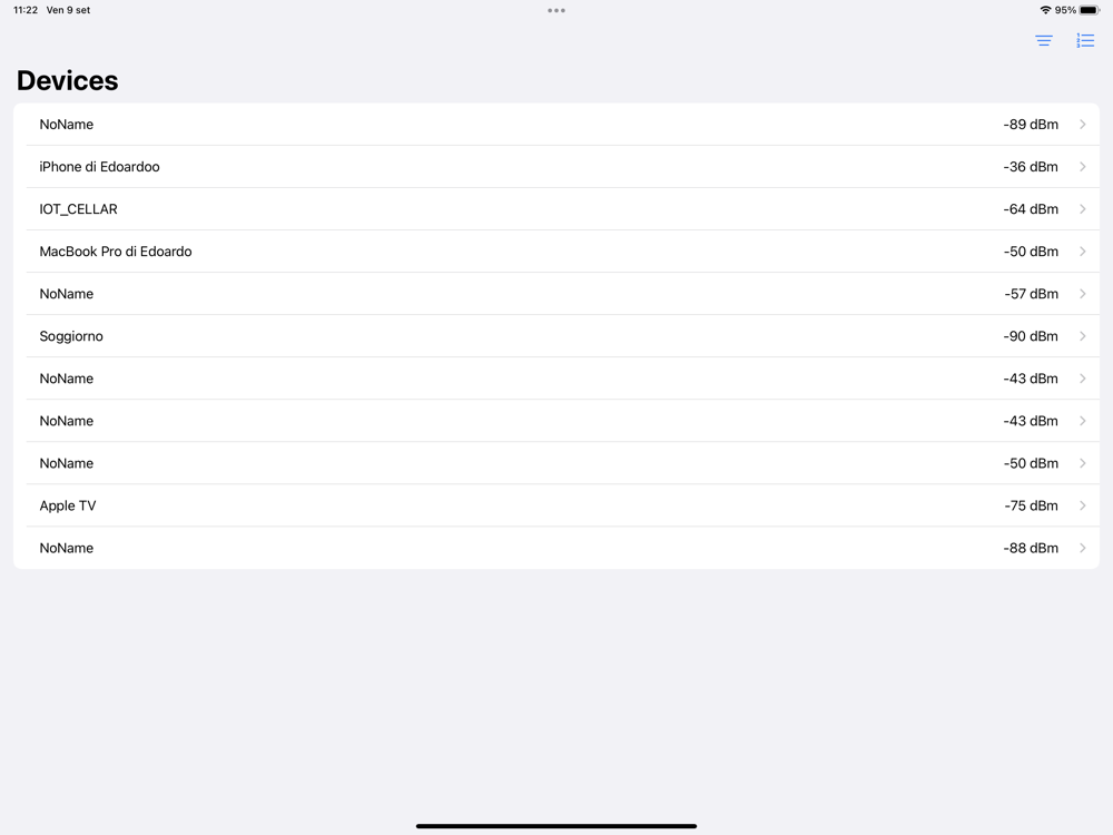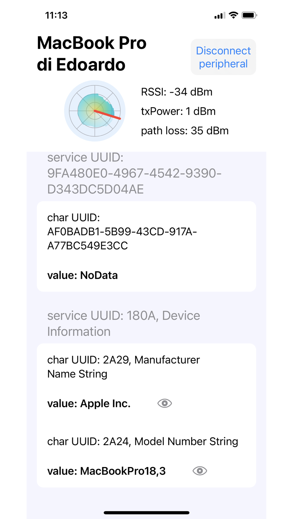 With this simple app you can scan the surrounding environment searching for peripherals, you will be able to connect to them and read every service and characteristic, you will also see a nice graph with the RSSI (received power) and, if available, the transmitted power and the corresponding path loss.