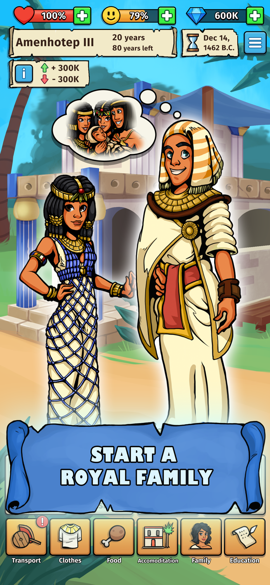 Start your way from a poor slave, upgrade your hero, work hard and get promotions in castes step by step. Different ways of earning money allow to create any story of success that you will choose. Your sim can walk in golden slippers or be a wise respected ruler, it is up to you!