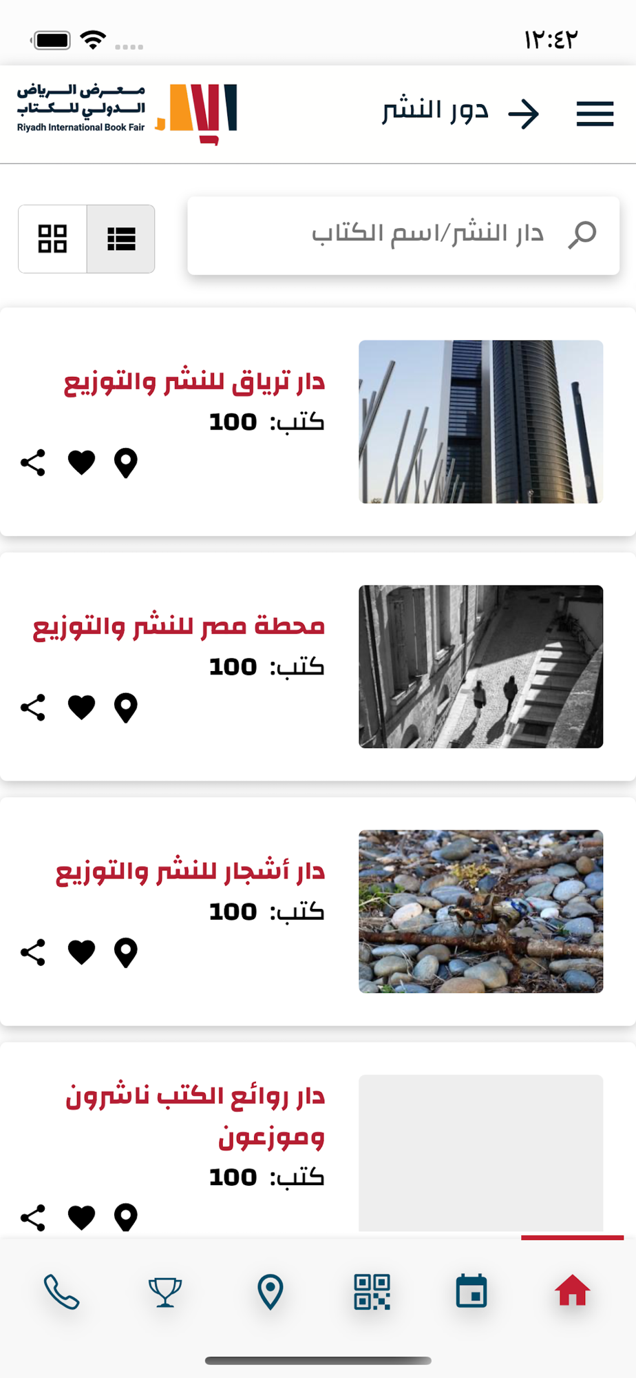 The Riyadh International Book Fair 2022 application presents several services to visitors and Publishing Houses, including the searching capability for books, Publishing Houses, authors, and the creation of Favorite List Service for Publishing Houses and books. It also provides a map of the exhibition with a reliable navigation feature. In addition, it offers the possibility to purchase tickets for concerts and cultural events accompanying the exhibition.