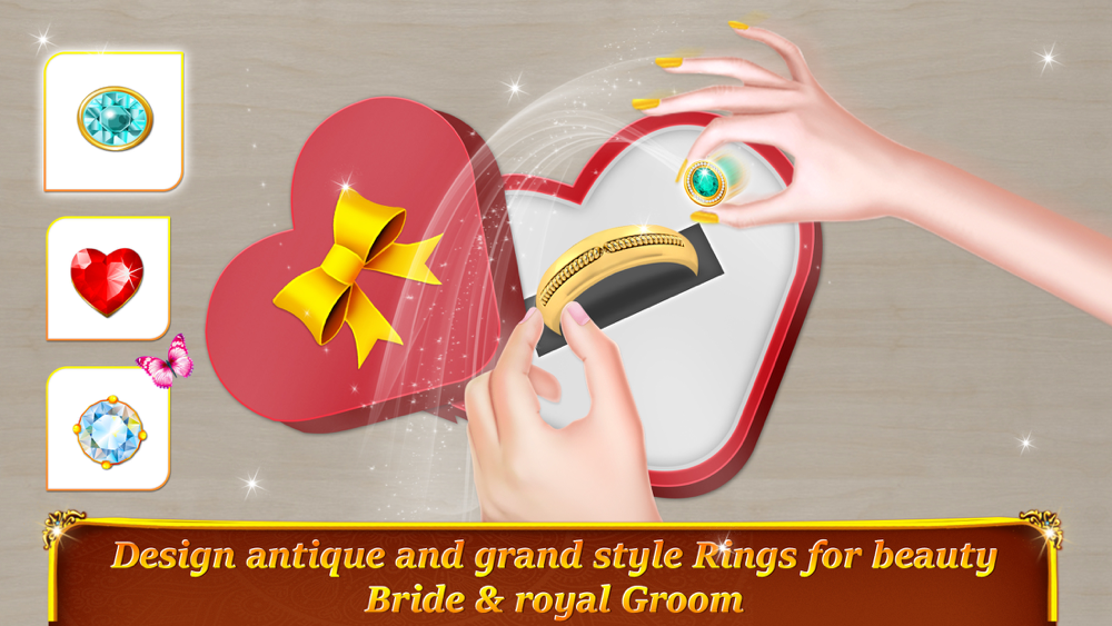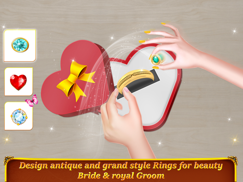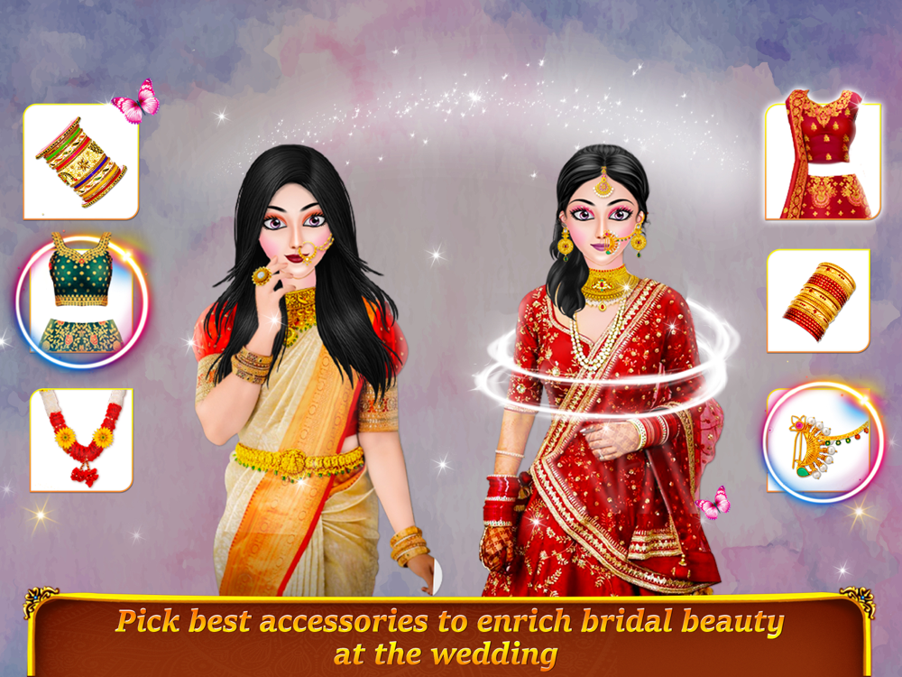 Make sure your beautiful bride looks absolutely stunning in marriage pictures with Indian cosmetics, beautiful braid hairstyle, lots of accessories like necklace, nose rinds, bindi, earrings, high heels for a glowing look. Royal Bride looks more beautiful in unique hair colour, eye shadow colour, blush colour, unique mascara colour, shining and attractive lipstick colour, eyebrow style and eye ball colour. Indian wedding salon games comes with tons of hair colour and hair style for all wedding rituals like engagement, mehndi (henna), haldi, mandap welcome ceremonies. Stylist dress up & makeup creativity is must in designing dress and makeover brides. Princess wedding makeup game for girls offers super beauty makeovers for royal brides. Dress them up in real designer style with elegant and fancy Indian dresses, sarees, lehenga cholis and other sparkly accessories. Hindu and christian Indian wedding games with levels offers designing that dress up for rituals and ceremonies for pretty princess brides. Celebrate special wedding party day like stylish dream wedding in Makeup games & dress up fashion stylist Indian wedding games.