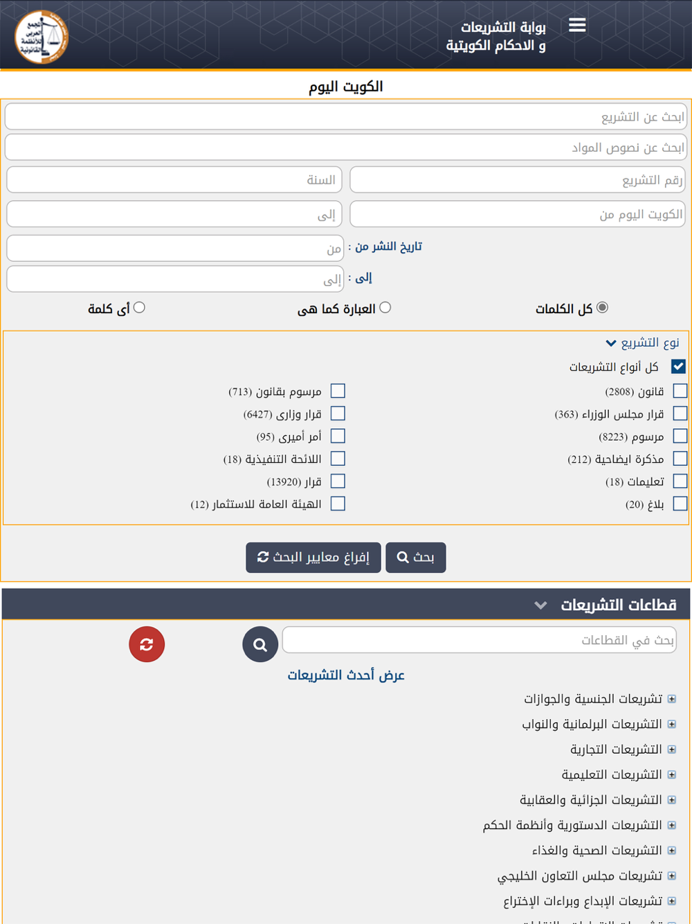 القوانين الرئيسية : وتضم كافة القوانين لدولة الكويت بكافة توابعها من مذكرات ايضاحية ولوائح تنفيذية وتعديلات قوانين مكملة – مراسيم - قرارات رئيس مجلس الوزراء أحكام محكمة التمييز الكويتية : وتشمل كافة الأحكام التي صدرت من محكمة التمييز الكويتية --- أحكام محكمة النقض المصرية: وتضم بشكل موضوعي طبقا للقوانين التي أسيرت بصددها من عام 1931 في أكثر من 130 ألف مبدأ أرسته محكمة النقض
