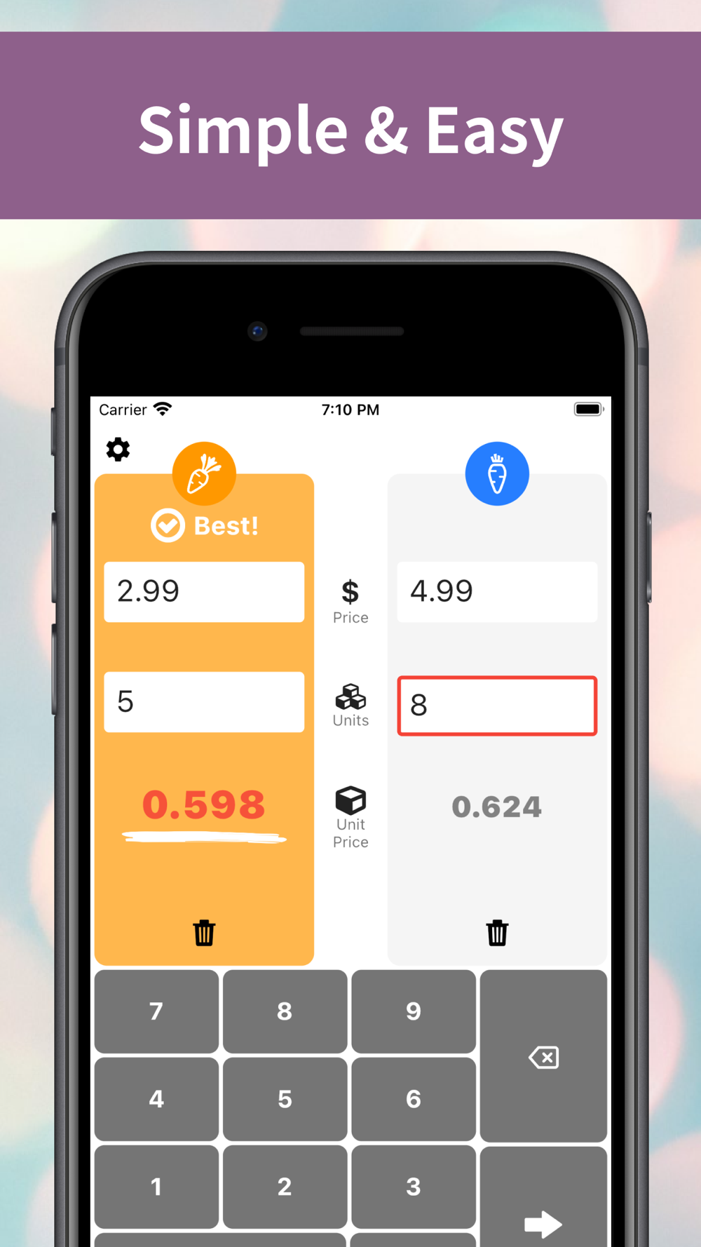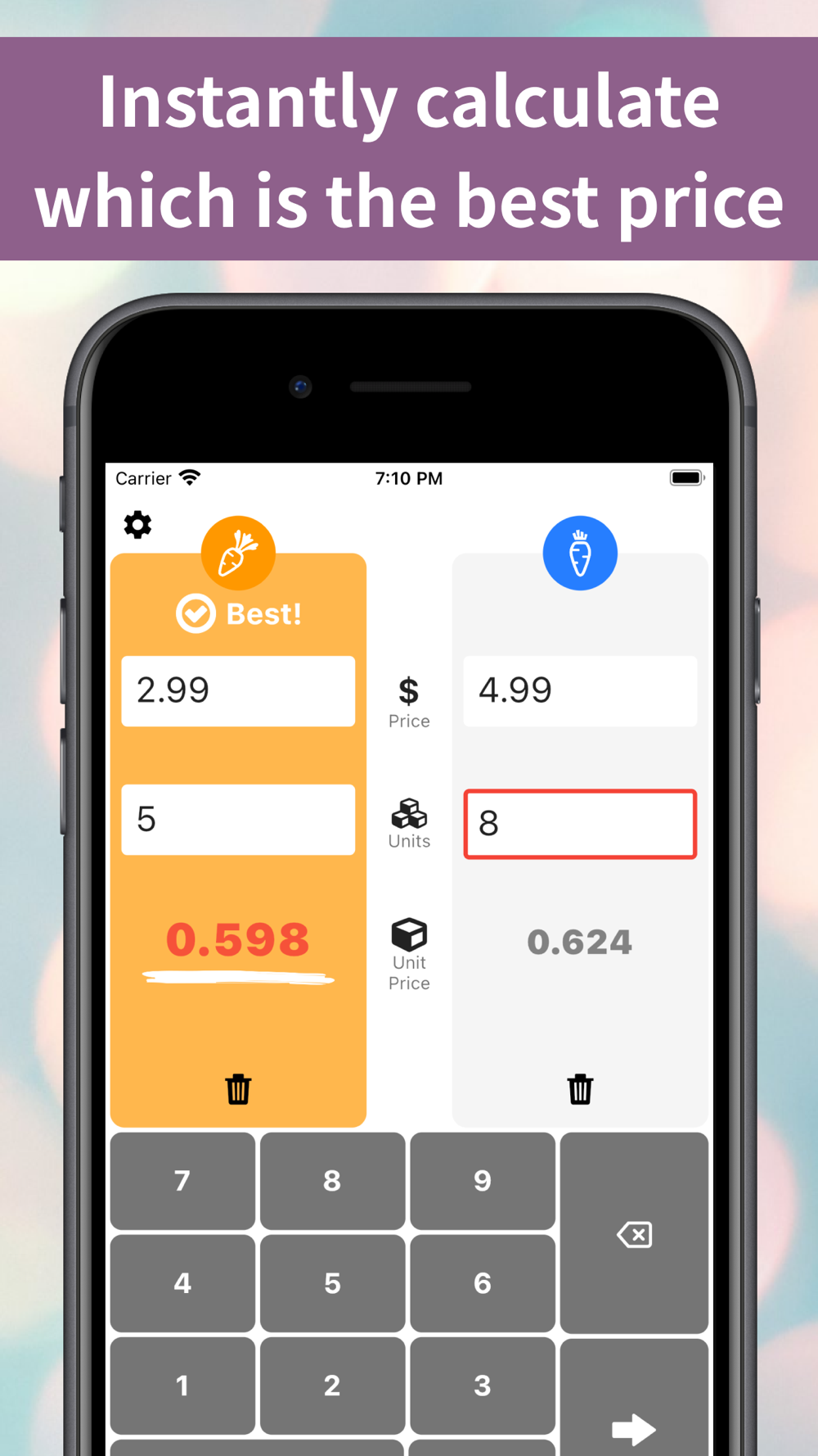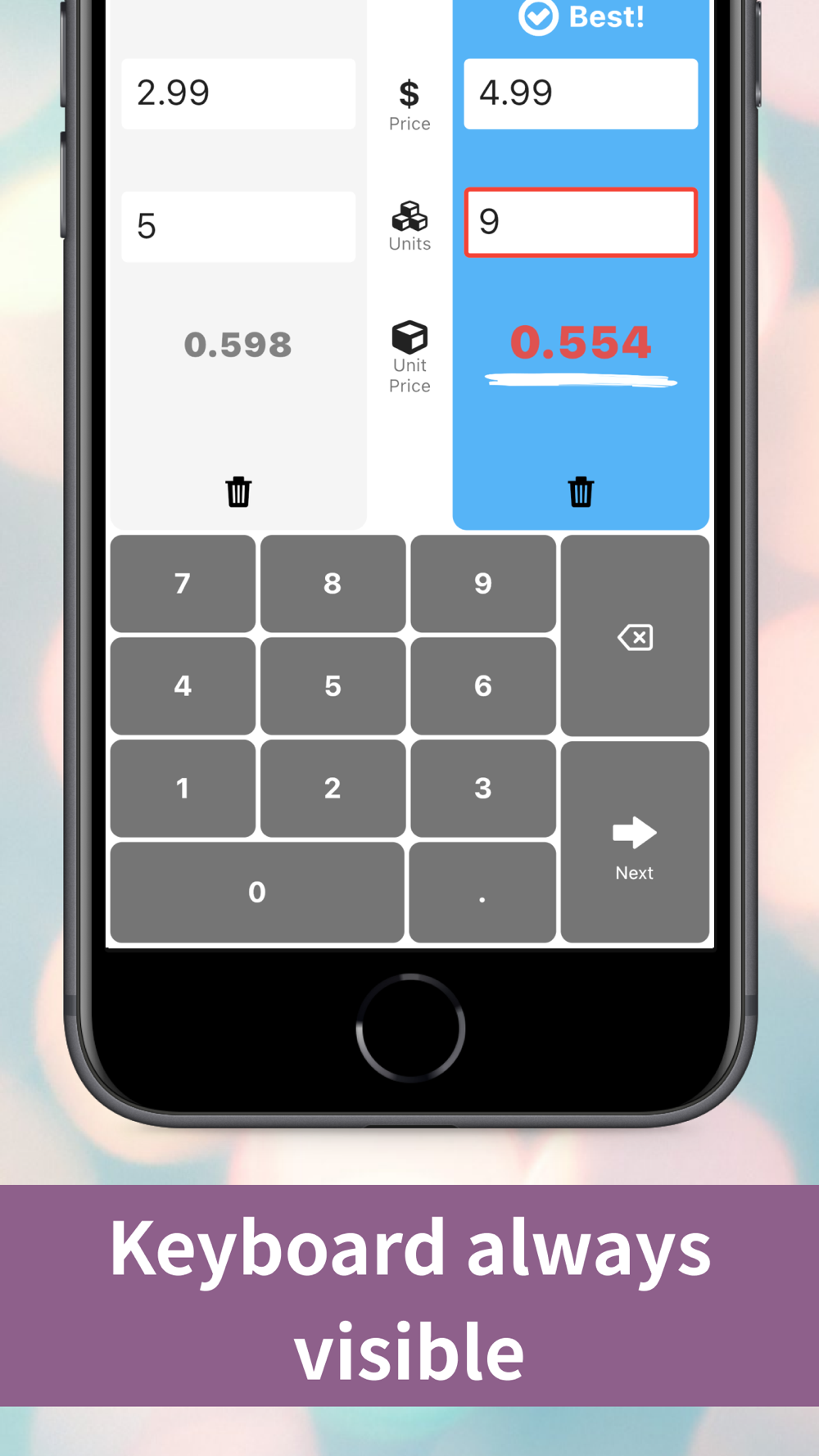Just enter the price and quantity, and it will immediately calculate which is the best price for you.