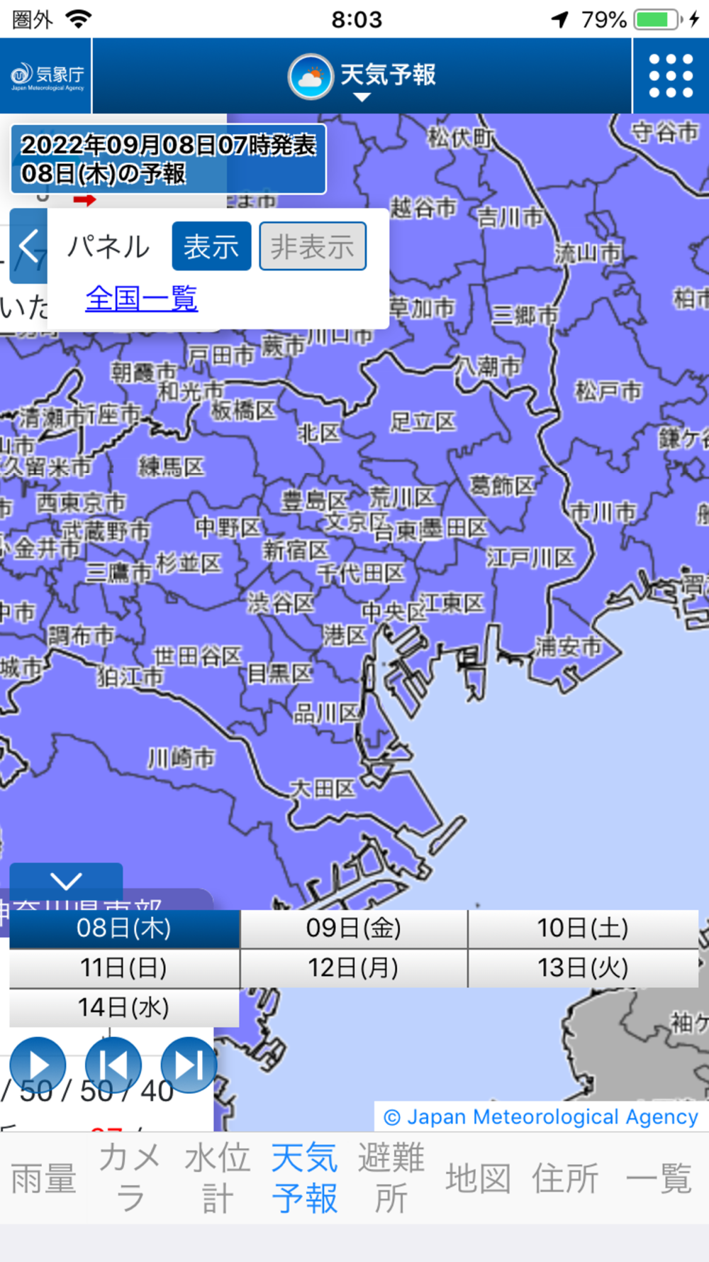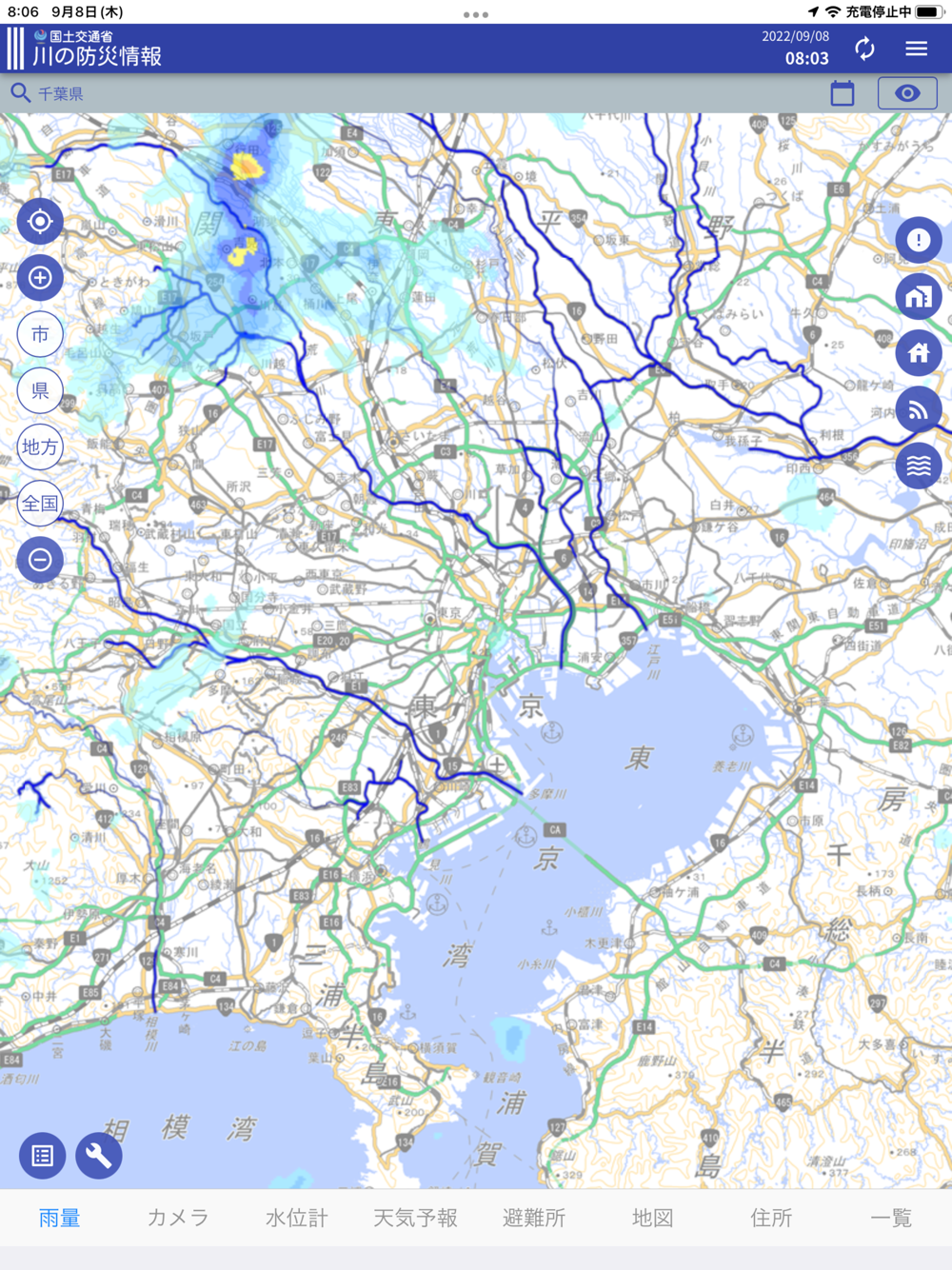 雨量、河川カメラ、水位計、天気予報、地図、地図、住所を表示します。国土交通省、気象庁、国土地理院のデータを利用しています。