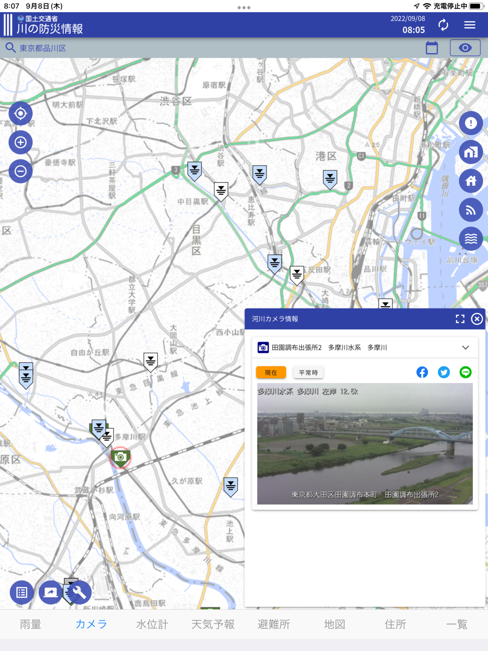 2.[カメラ]は、河川に設置されているライブカメラで、現在の河川の様子を見ることができます。国土交通省のデータを使用しています。