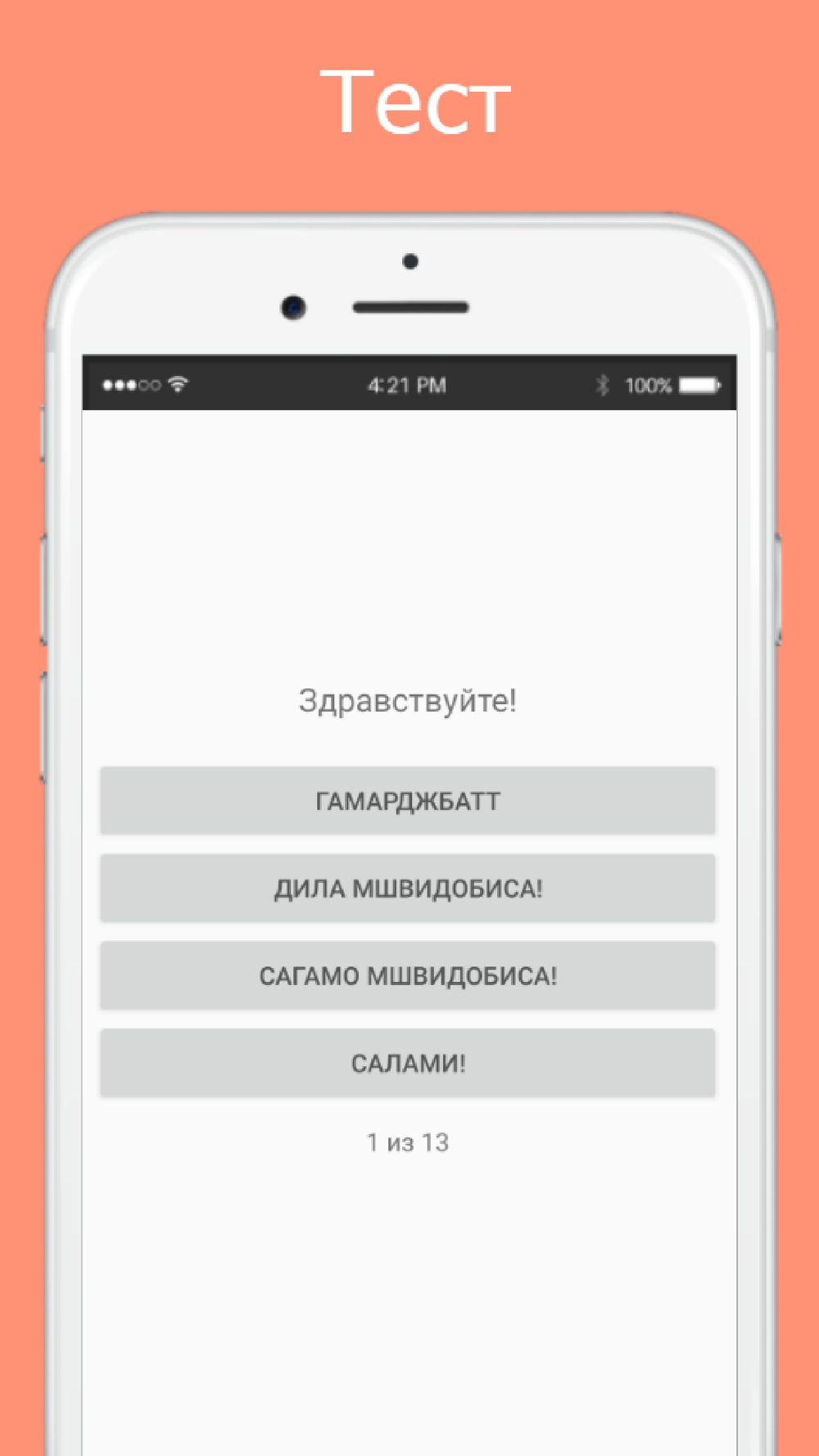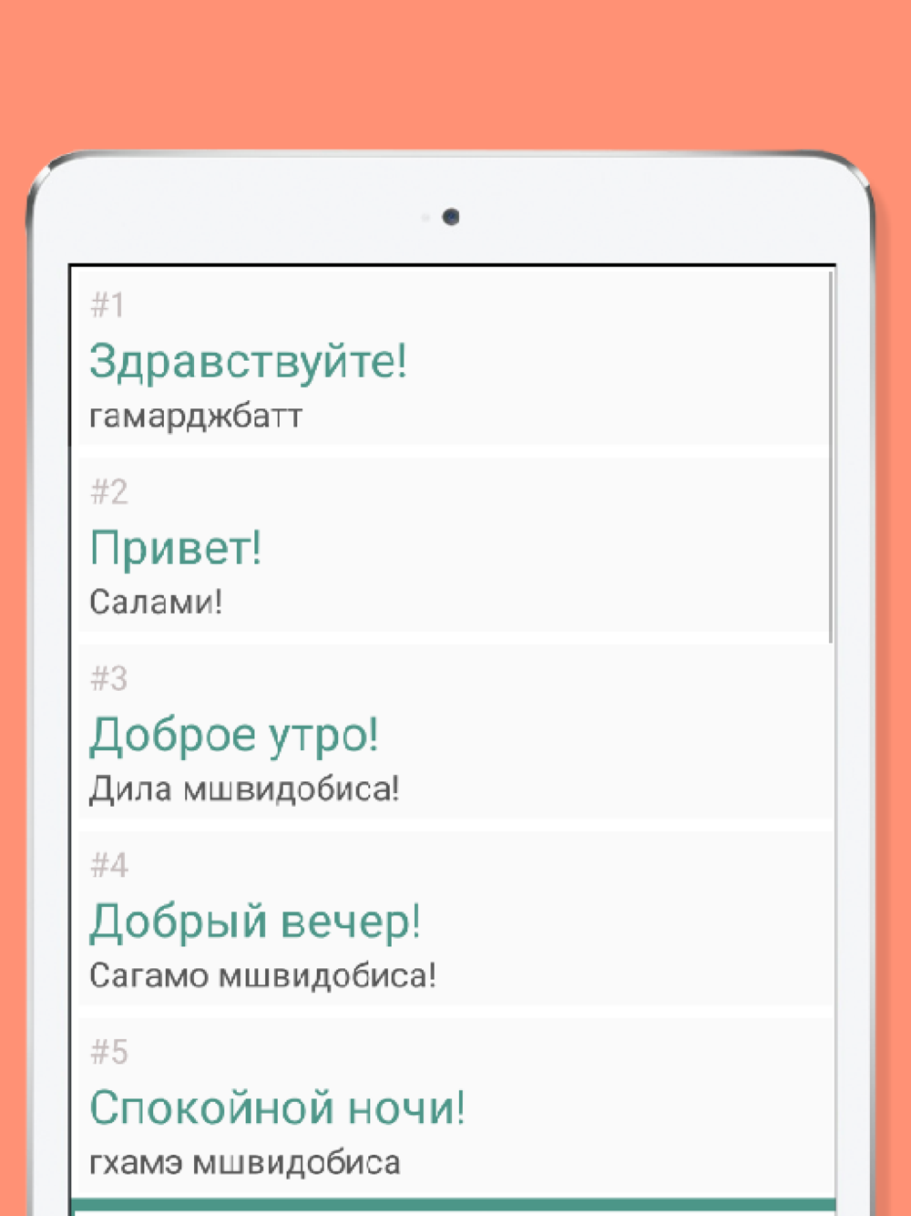 Русско-грузинский разговорник можно использовать соответственно, как разговорник, так и инструмент для изучения грузинского языка. Все грузинские слова написаны русскими буквами и разбиты на 11 логических тем, то есть разговорник рассчитан на русскоговорящего пользователя (туриста).