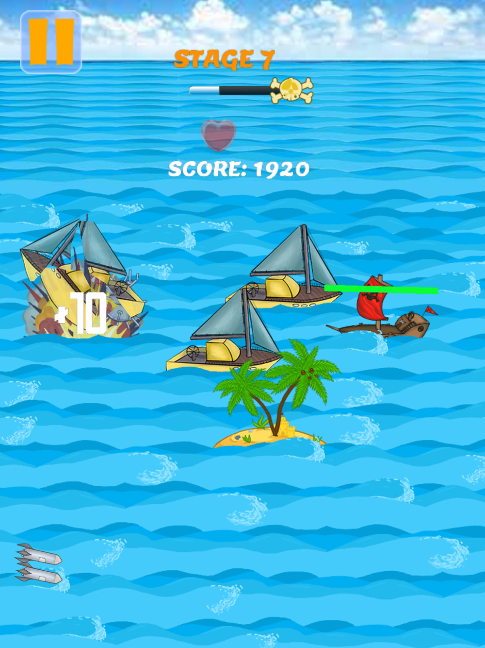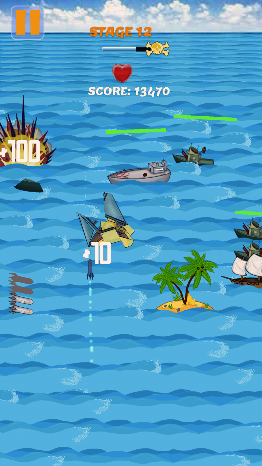 Destroy floating barrels to get various bonuses or increase the number of torpedoes that can be fired at the same time. Islands and mines will prevent you from hitting ships.