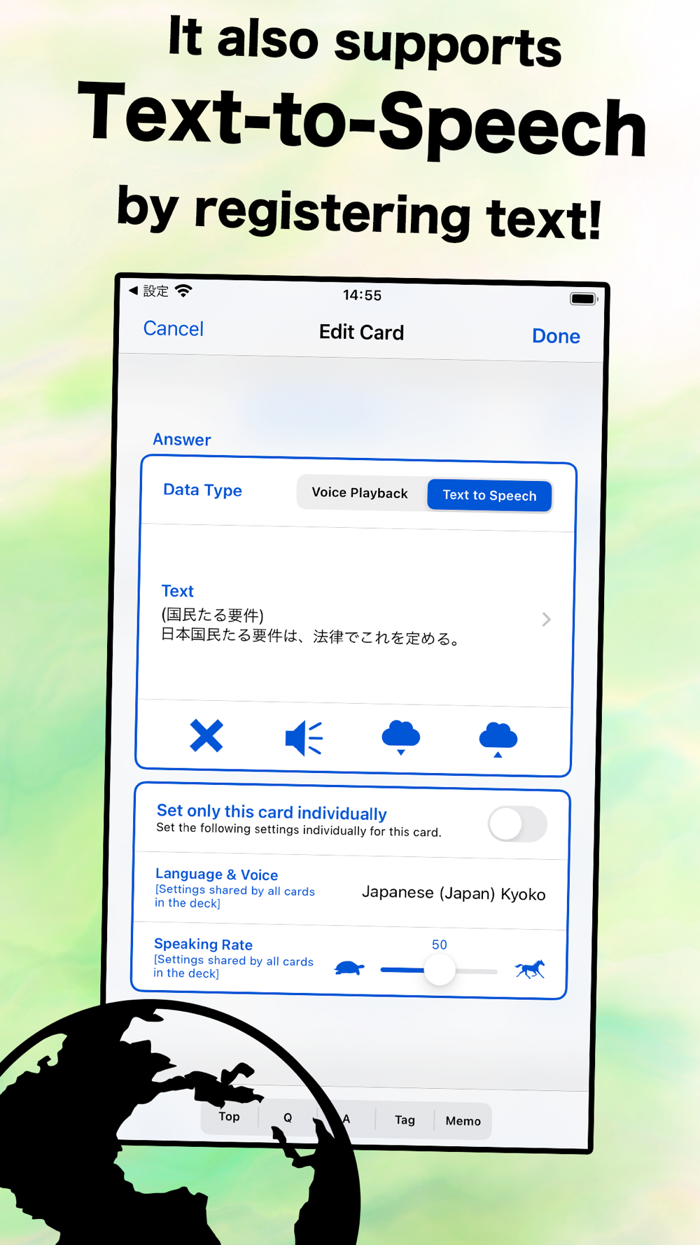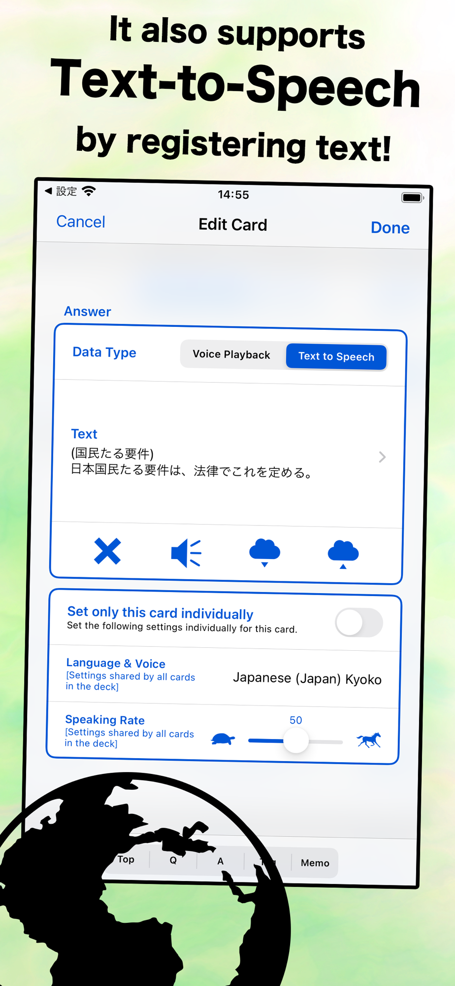 Rather than inputting traditional text-based questions and answers, Voice FlashCards 2 allows you to register either audio data or text data for text-to-speech functionality. A unique feature enables users to record questions and answers using the voices of their loved ones, whether it be a partner, friend, or family member.