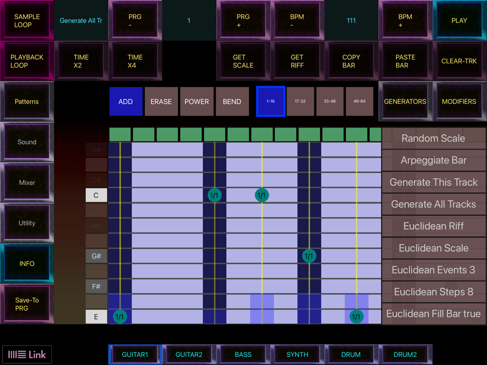 Many different ways to generate or modify patterns that intelligently conform the patters for each instrument.