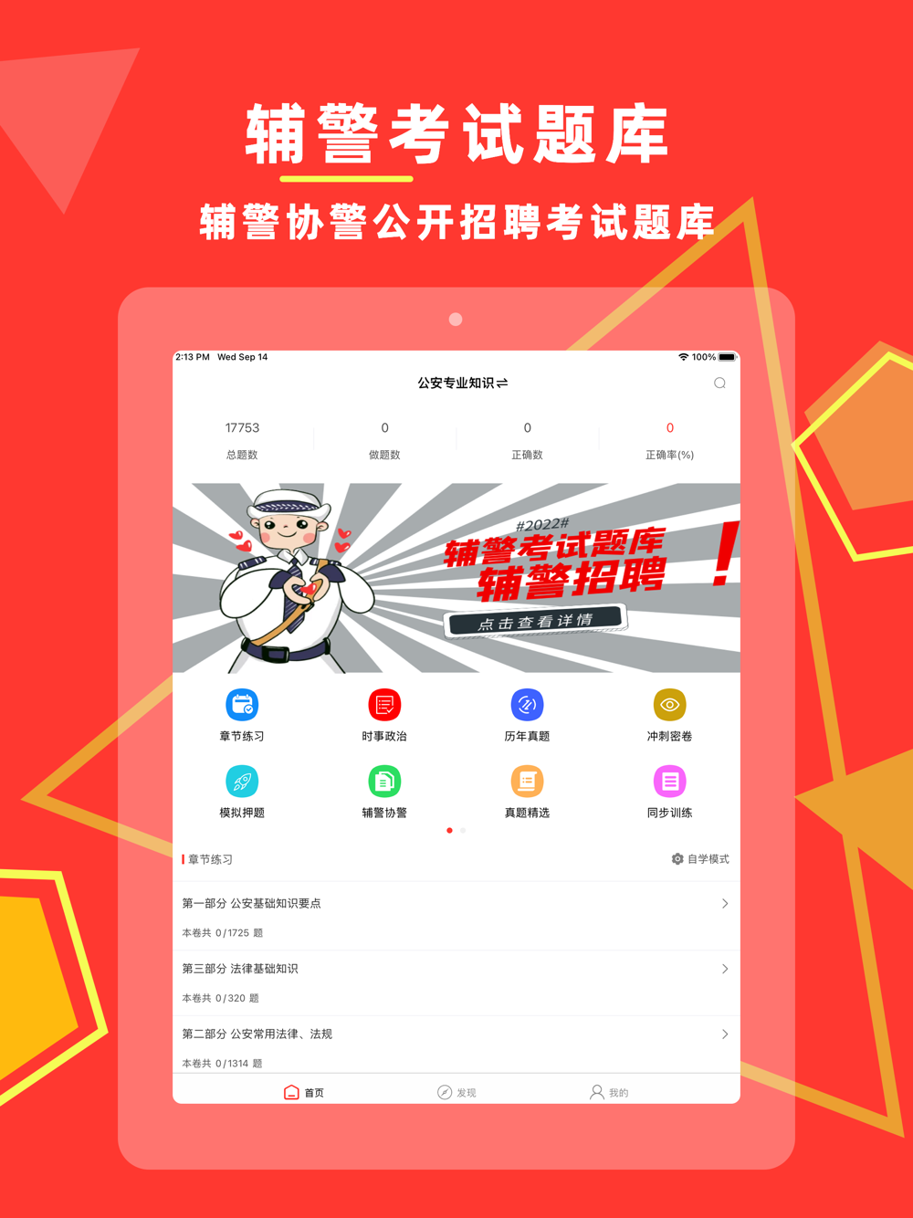辅警协警考试题库包括公安,辅警,协警,警务辅助工作的人员考试的题库,包括:公安基础知识、法律基础知识、公安专业知识、法律基础知识、公共基础知识、主要执法依据、行政职业能力测验等,章节练习+历年真题+高频考点+摸拟押题,助顺利通关。