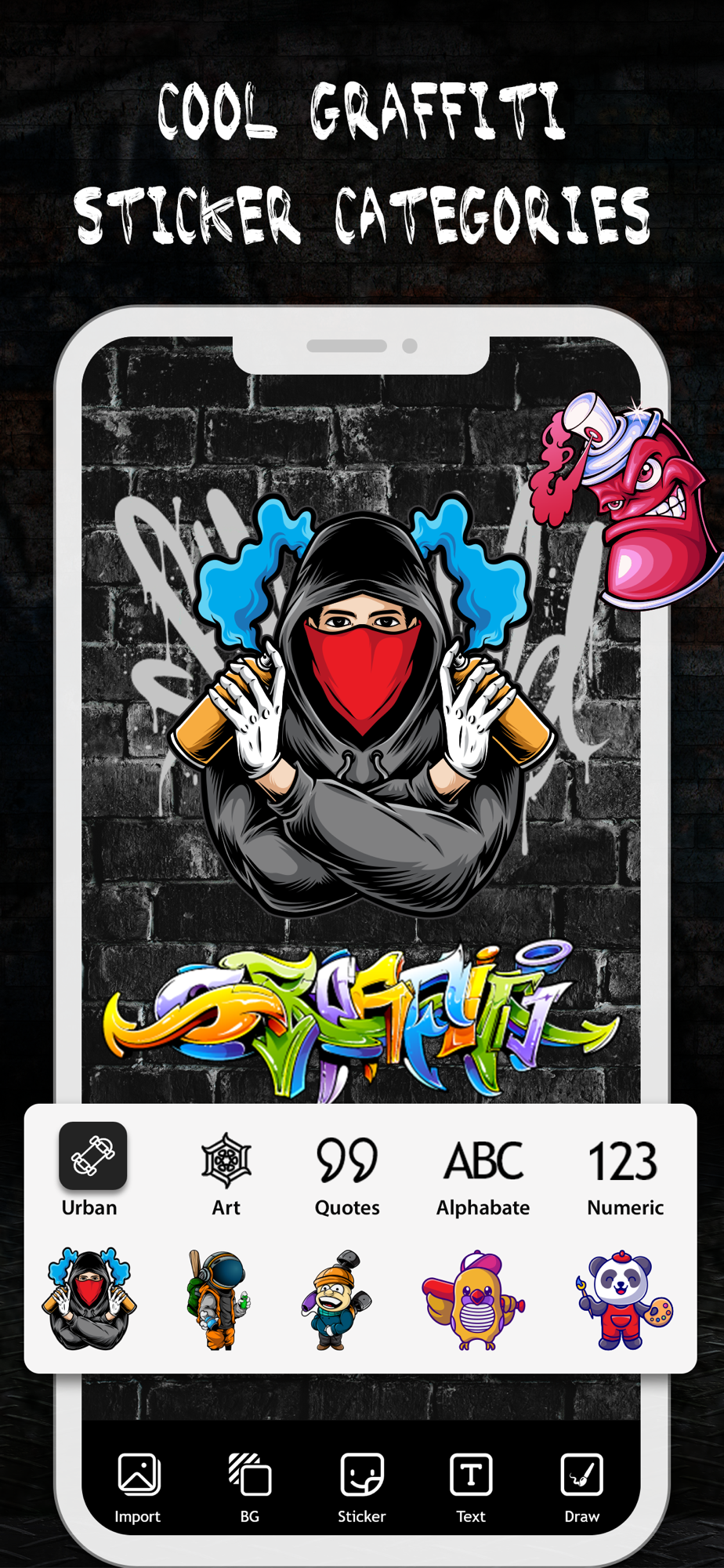 Graffiti maker tool has different categories of graffiti stickers; art, urban, quote, alphabets, and numerical stickers to design graffiti art.